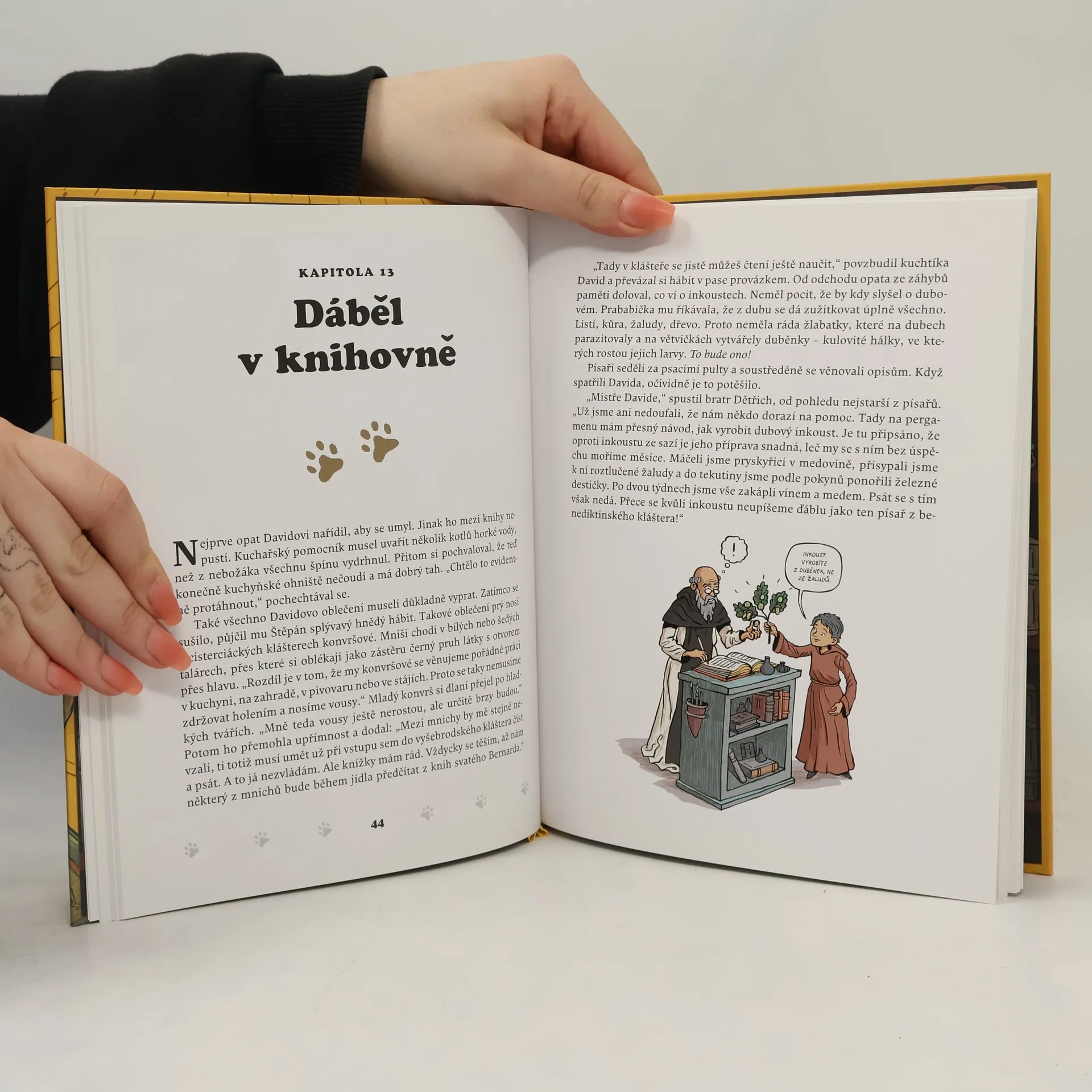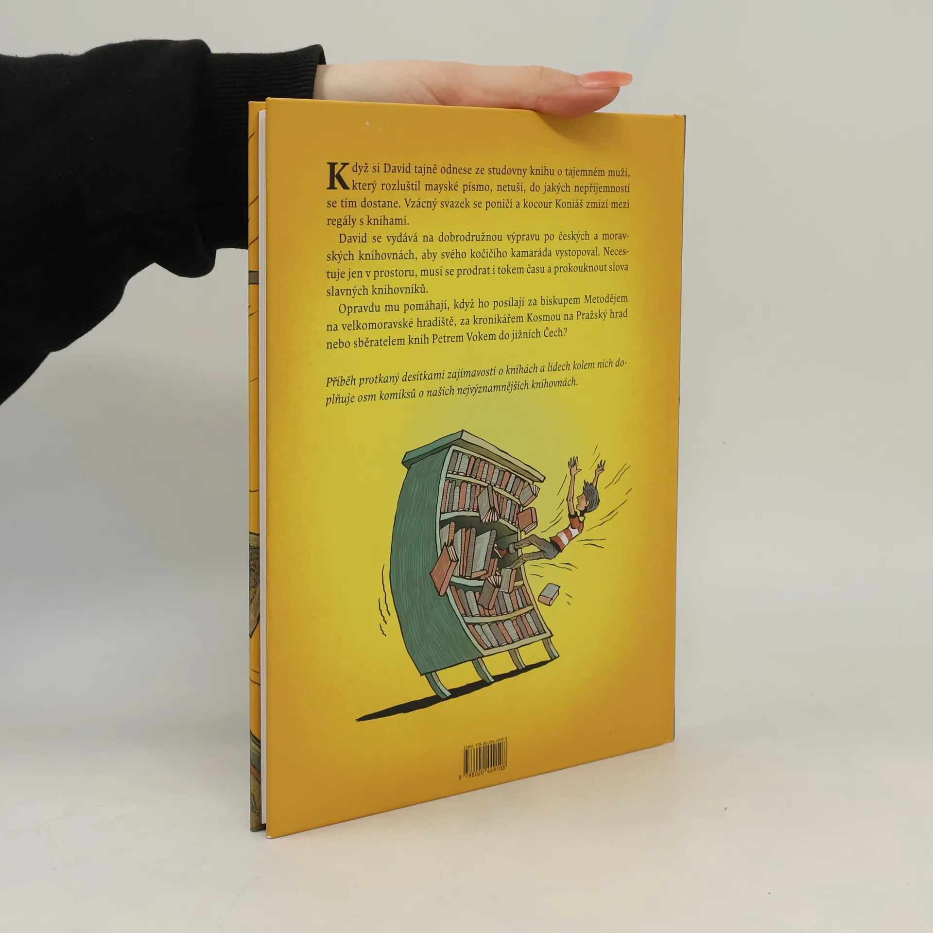 David je náruživý čtenář a každý ví, že při čtení běží čas jinak. Zastavuje se, všelijak se kroutí a pak se klidně obrátí čelem vzad. Kocour Koniáš zálibu svého pána ve čtení zprvu s kočičím nezájmem přehlížel, jenže pak se sám mezi knihami ztratil. David stopuje kocoura a jeho stopy ho dovedou do mnoha českých a moravských knihoven. Jenže chlapec necestuje jen z Prahy do Brna, z Brna do Třeboně a z Třeboně do Podlažic, cestuje také časem, neboť knihovny jsou do sebe knihami zaklesnuté jako most, který spojuje přítomnost s minulostí. Na kocoura ztraceného mezi knihami se musí David vyptat těch nejpovolanějších – knihovníků. Pomůže mu snaživý knihovník Petra Voka či tajnůstkářský Václav Hanka z muzejní knihovny? A může vůbec věřit slovům uhrančivého Jiřího Mahena, knihovníka s černými kruhy pod očima?