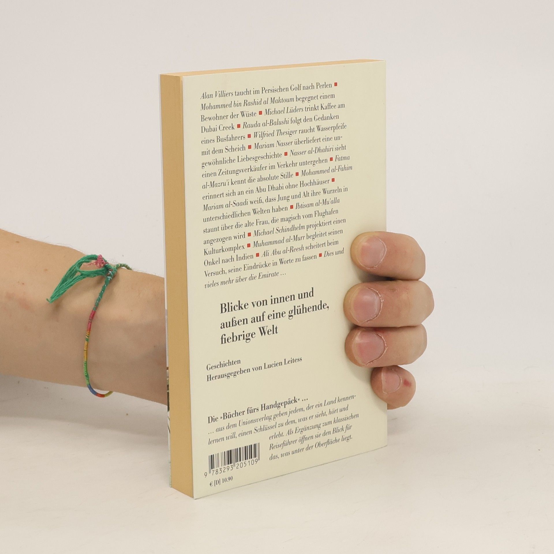 Alan Villiers taucht im Persischen Golf nach Perlen Mohammed bin Rashid al Maktoum begegnet einem Bewohner der Wüste Michael Lüders trinkt Kaffee am Dubai Creek Rauda al-Balushi folgt den Gedanken eines Busfahrers Wilfried Thesiger raucht Wasserpfeife mit dem Scheich Mariam Nasser überliefert eine ungewöhnliche Liebesgeschichte Nasser al-Dhahiri sieht einen Zeitungsverkäufer im Verkehr untergehen Fatma al-Mazru’i kennt die absolute Stille Mohammed al-Fahim erinnert sich an ein Abu Dhabi ohne Hochhäuser Mariam al-Saadi weiß, dass Jung und Alt ihre Wurzeln in unterschiedlichen Welten haben Ibtisam al-Mu’alla staunt über die alte Frau, die magisch vom Flughafen angezogen wird Michael Schindhelm projektiert einen Kulturkomplex Muhammad al-Murr begleitet seinen Onkel nach Indien Ali Abu al-Reesh scheitert beim Versuch, seine Eindrücke in Worte zu fassen Dies und vieles mehr über die Emirate …