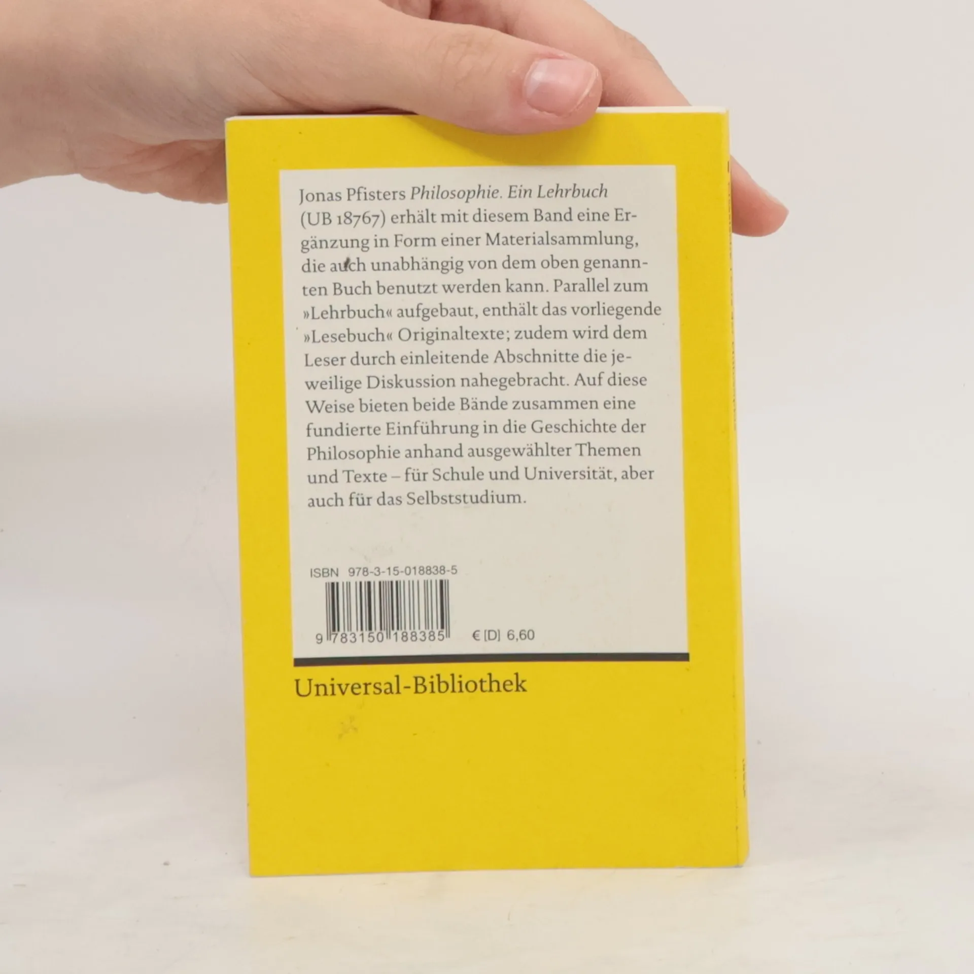 Diese Materialsammlung enthält klassische Texte der Philosophiegeschichte. Kleine Einführungstexte machen den Leser mit den jeweiligen Zusammenhängen und Hintergründen vertraut. Der Band ist als Seitenstück zu Jonas Pfisters erfolgreichem »Lehrbuch« konzipiert und parallel aufgebaut. Auf diese Weise bieten das »Lehrbuch« und dieses »Lesebuch« zusammen anhand ausgewählter Themen eine fundierte Einführung in die Geschichte der Philosophie – für die Schule und die Universität, aber auch für das Selbststudium. Selbstverständlich können die Texte für sich stehen und sind auch ohne »Lehrbuch« verständlich.