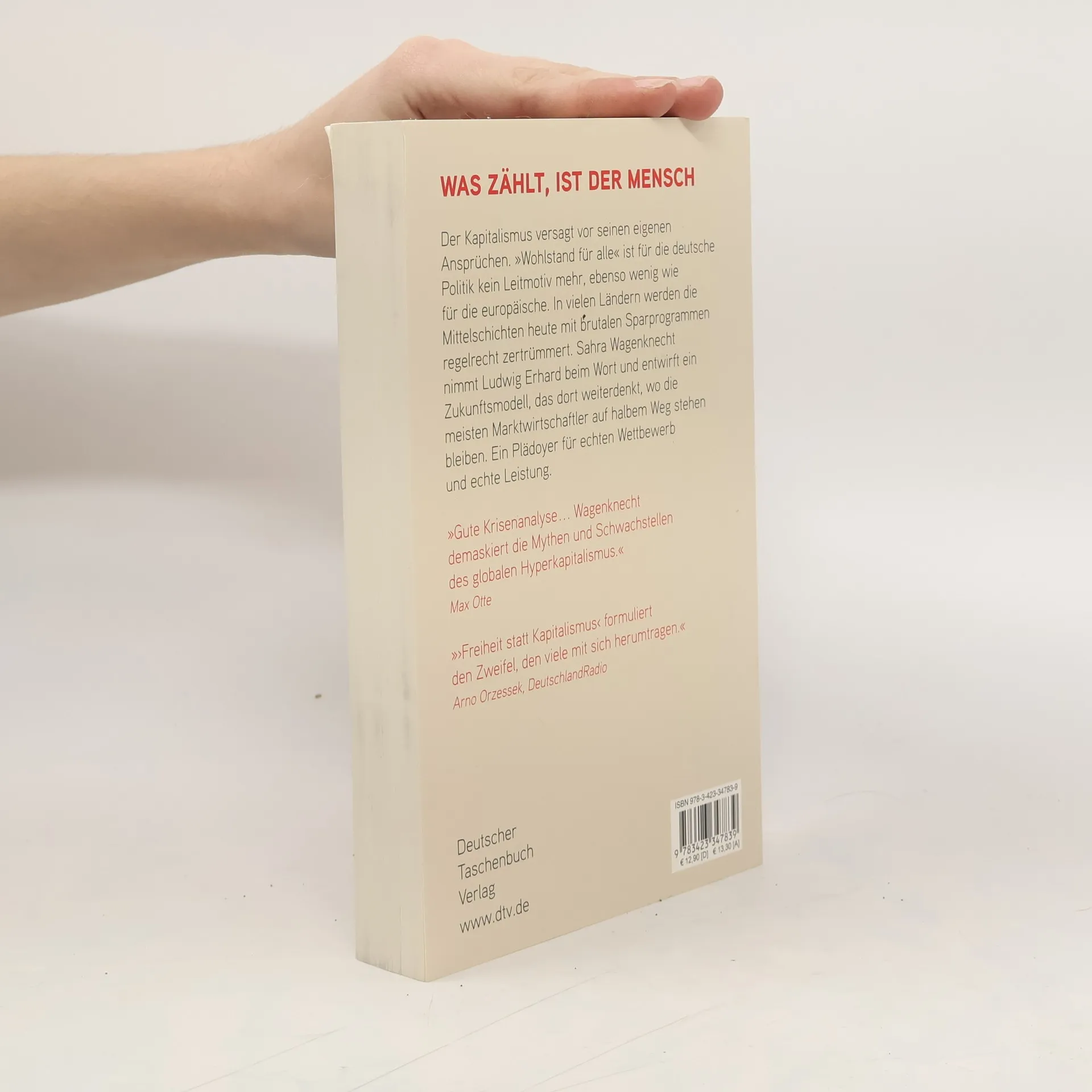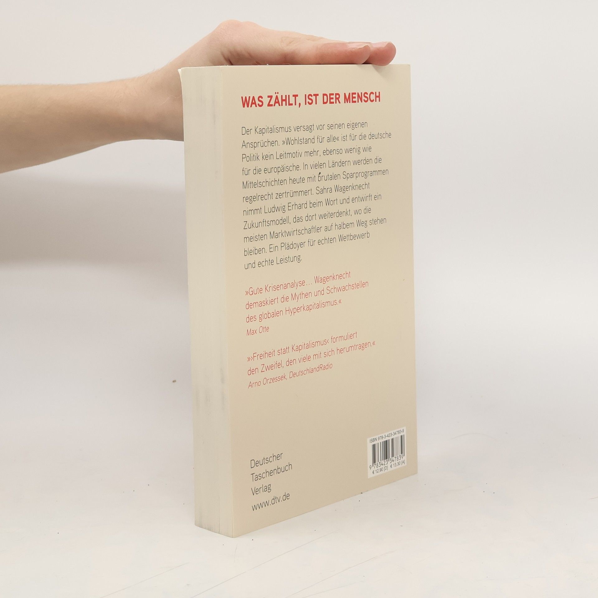 Was zählt, ist der Mensch Wettbewerb oder Leistung sind nicht mehr die zentralen Merkmale und Perspektiven unserer Wirtschaft, so die Autorin. Wenn Ökonomie die Kunst des Anreizesetzens ist, wirken heute die falschen, denn sie belohnen abstrakte Renditeziele und Jobvernichtung statt Erhalt und Ausbau von Arbeitsplätzen, Umweltschonung und Unternehmenswachstum. Sahra Wagenknecht nimmt die Theoretiker der Sozialen Marktwirtschaft wie Walter Eucken und Ludwig Erhard beim Wort und beschreibt es als dringlichste Herausforderung an die Wirtschaft, wieder produktiv und innovativ zu sein. Denn es muss nicht nur gerechter verteilt werden, es muss auch wieder mehr zu verteilen geben.