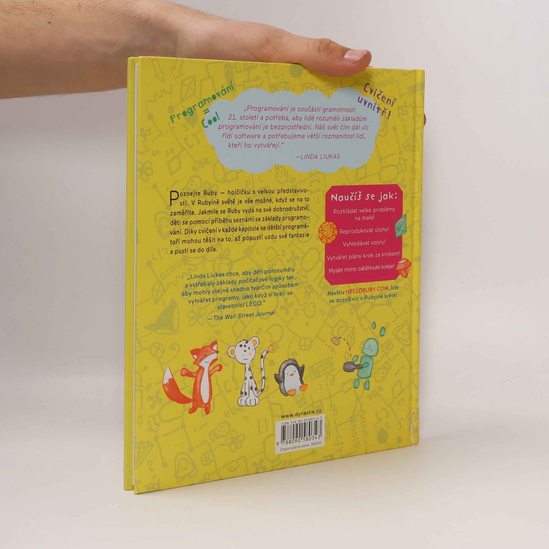 Poznejte Ruby — holčičku s velkou představivostí. V Rubyině světě je vše možné, když se na to zaměříte. Jakmile se Ruby vydá na své dobrodružství, děti se pomocí příběhu seznámí se základy programování. Díky cvičení v každé kapitole se dětští programátoři mohou těšit na to, až popustí uzdu své fantazie a pustí se do díla. Děti díky knize HELLO RUBY porozumí a vstřebají základy počítačové logiky tak, že budou moci stejně snadno tvůrčím způsobem vytvářet programy, jako když si hrají se stavebnicí nebo s LEGO kostičkami. „Programování je součástí gramotnosti 21. století a potřeba, aby lidé rozuměli základům programování je bezprostřední. Náš svět čím dál víc řídí software a potřebujeme větší rozmanitost lidí, kteří ho vytvářejí.” Linda Liukas S HELLO RUBY se děti naučí jak: - rozkládat velké problémy na malé - reprodukovat úlohy - vyhledávat vzory! - vytvářet plány krok za krokem - myslet mimo zaběhnuté koleje
