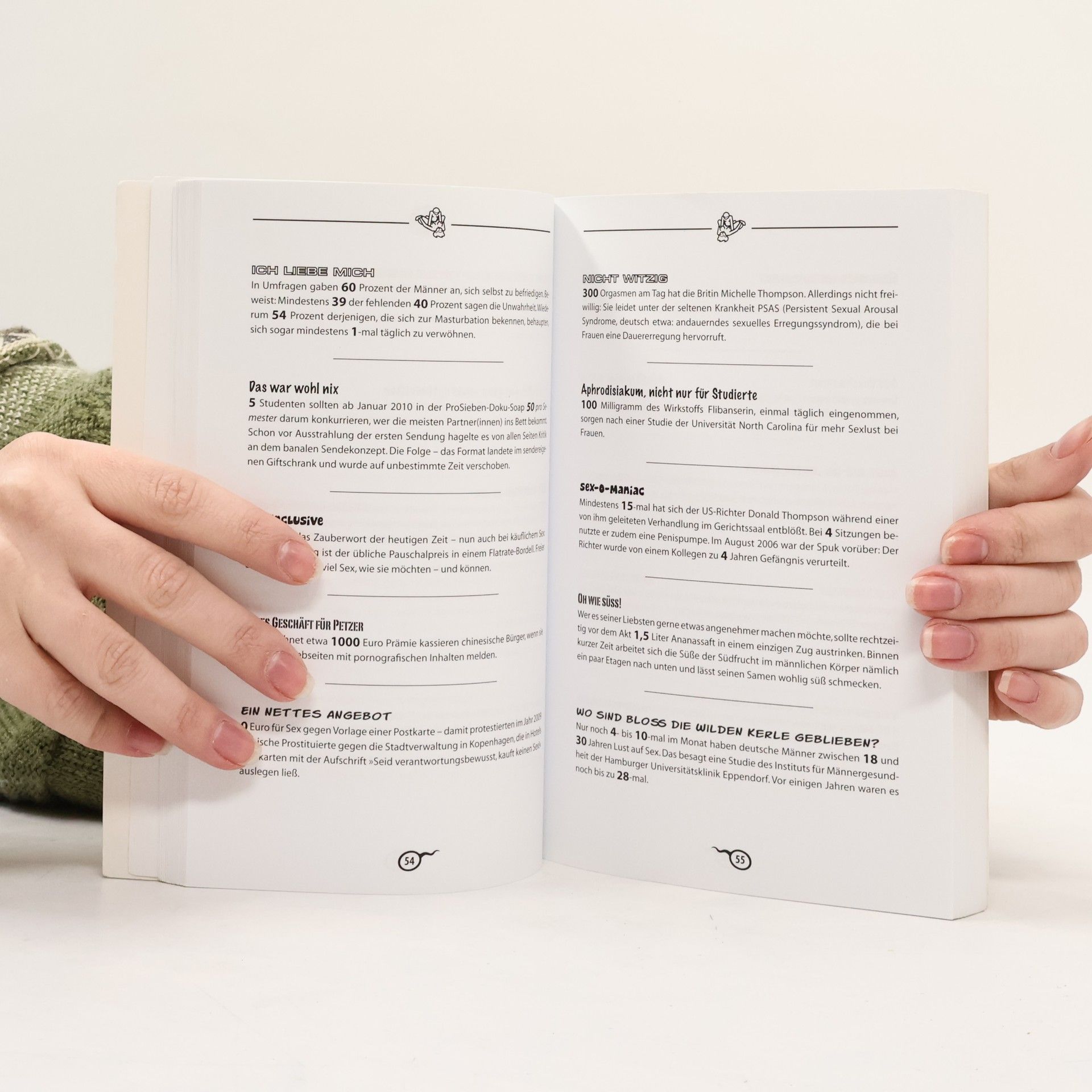 **Zahlen und Fakten, die Sie immer schon über Sex wissen wollten** Das Thema, das jeden Tag die Welt bewegt? Sex! Alle wollen ihn, alle reden darüber und Zeitschriften und Fernsehsendungen sind voll davon. Doch es gibt noch eine ganz andere Sicht auf das Zwischenmenschliche: Zahlen und Fakten! Dieses Buch enthält unzählige überraschende, lustige, verblüffende und manchmal schier unglaubliche Tatsachen um das Thema Sex und Erotik. Oder wussten Sie, dass die Österreicher mit durchschnittlich 29,3 Frauen in ihrem Leben die meisten Sexualpartner weltweit haben? Dass durch eine Absatzhöhe von sieben Zentimetern durch das damit verbundene Beckenbodenmuskeltraining der weibliche Orgasmus intensiviert wird? Oder dass der Durchschnittsdeutsche in seinem Leben rund 6 Wochen mit Vorspiel verbringt?