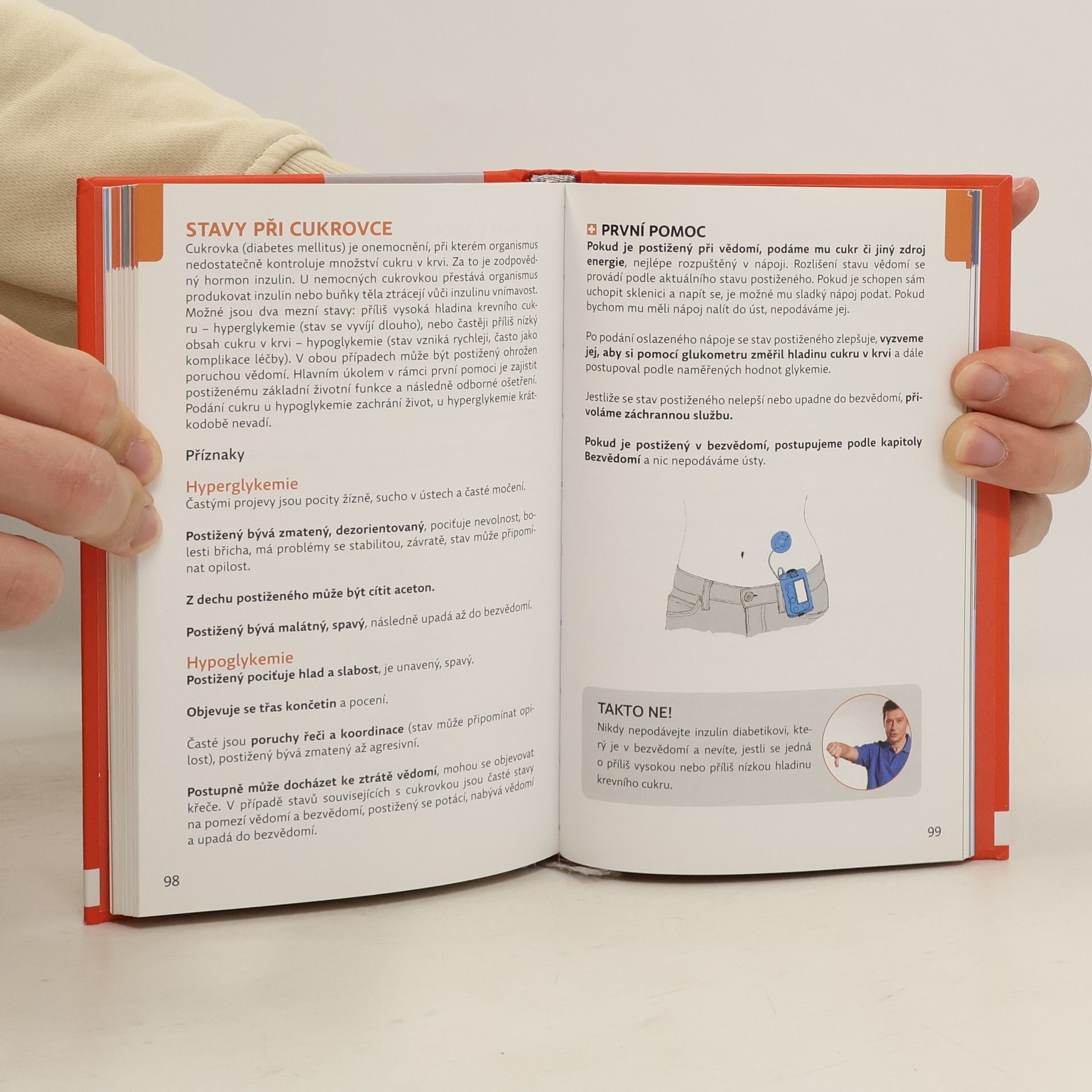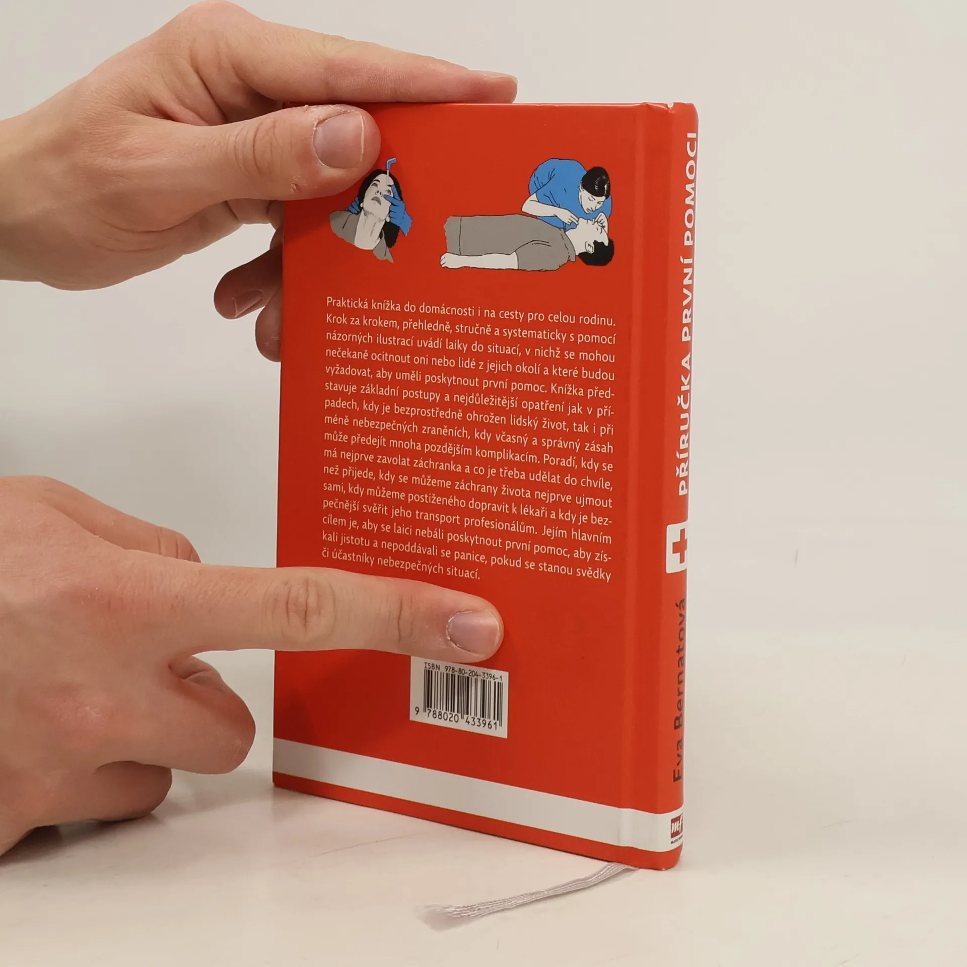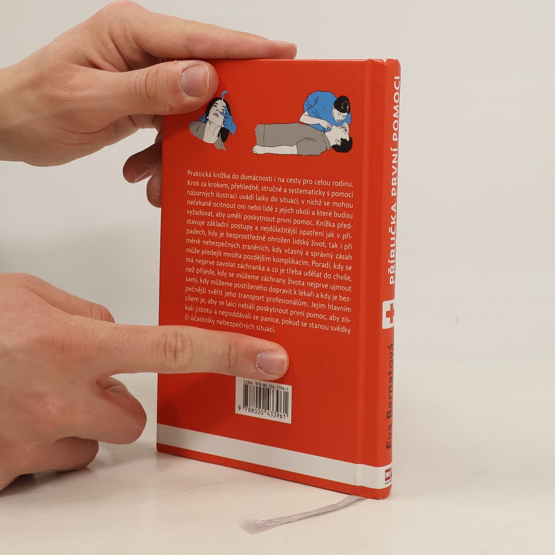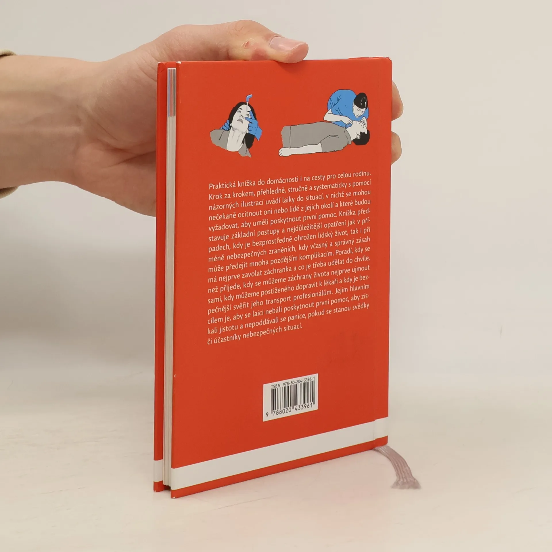 Praktická knížka do domácnosti i na cesty pro celou rodinu. Krok za krokem, přehledně, stručně a systematicky s pomocí názorných ilustrací uvádí laiky do situací, v nichž se mohou nečekaně ocitnout oni nebo lidé z jejich okolí a které budou vyžadovat, aby uměli poskytnout první pomoc. Knížka představuje základní postupy a nejdůležitější kroky jak v případech, kdy je bezprostředně ohrožen lidský život, tak i při méně nebezpečných zraněních, kdy včasný a správný zásah může předejít mnoha pozdějším komplikacím. Poradí, kdy se má nejprve zavolat záchranka a co je třeba udělat do chvíle, než přijede, kdy se můžeme záchrany života nejprve ujmout sami, kdy můžeme postiženého dopravit k lékaři a kdy je bezpečnější svěřit jeho transport profesionálům. Jejím hlavním cílem je, aby laici nebáli poskytnout první pomoc, aby získali jistotu a nepoddávali se panice, pokud se stanou svědky nebezpečných situací.