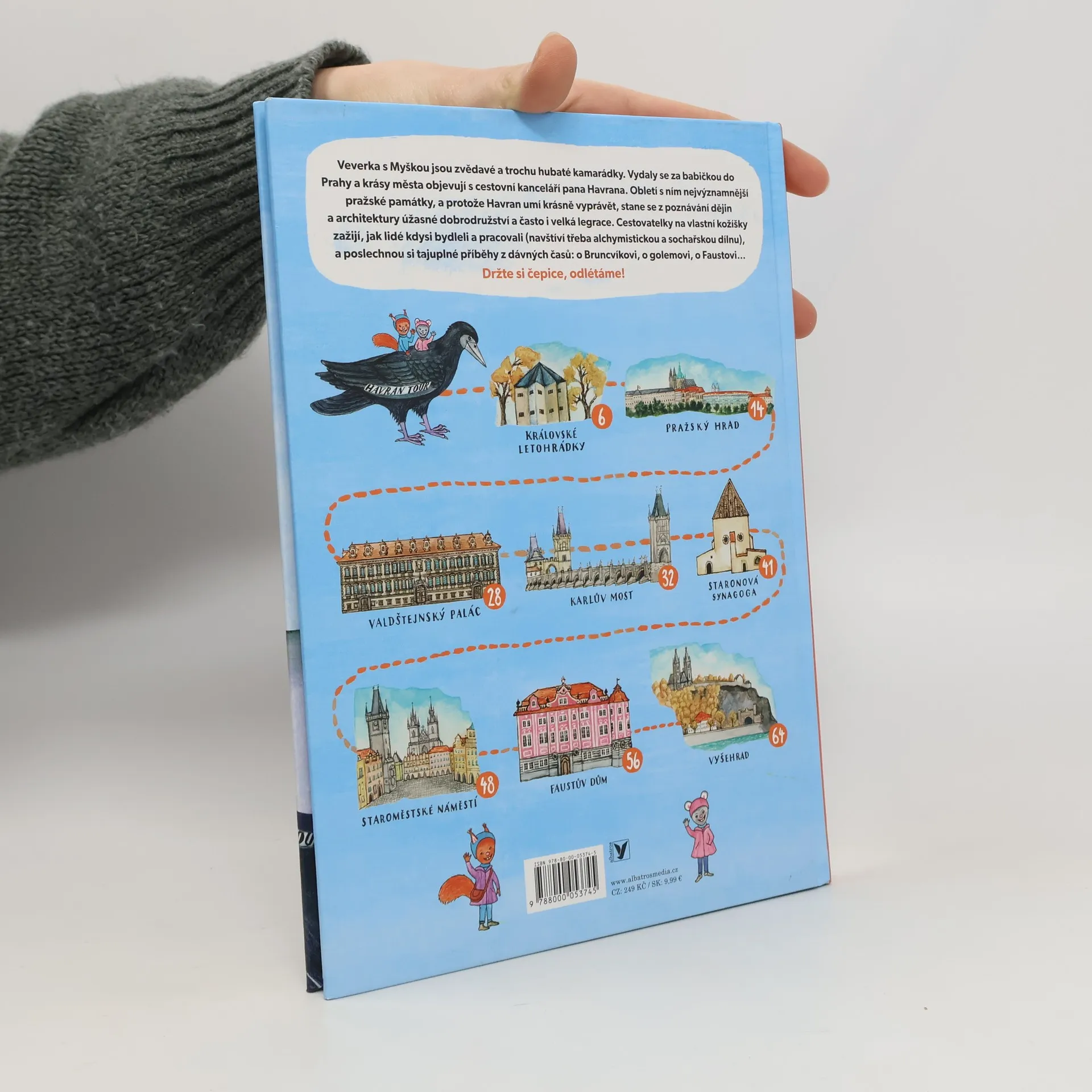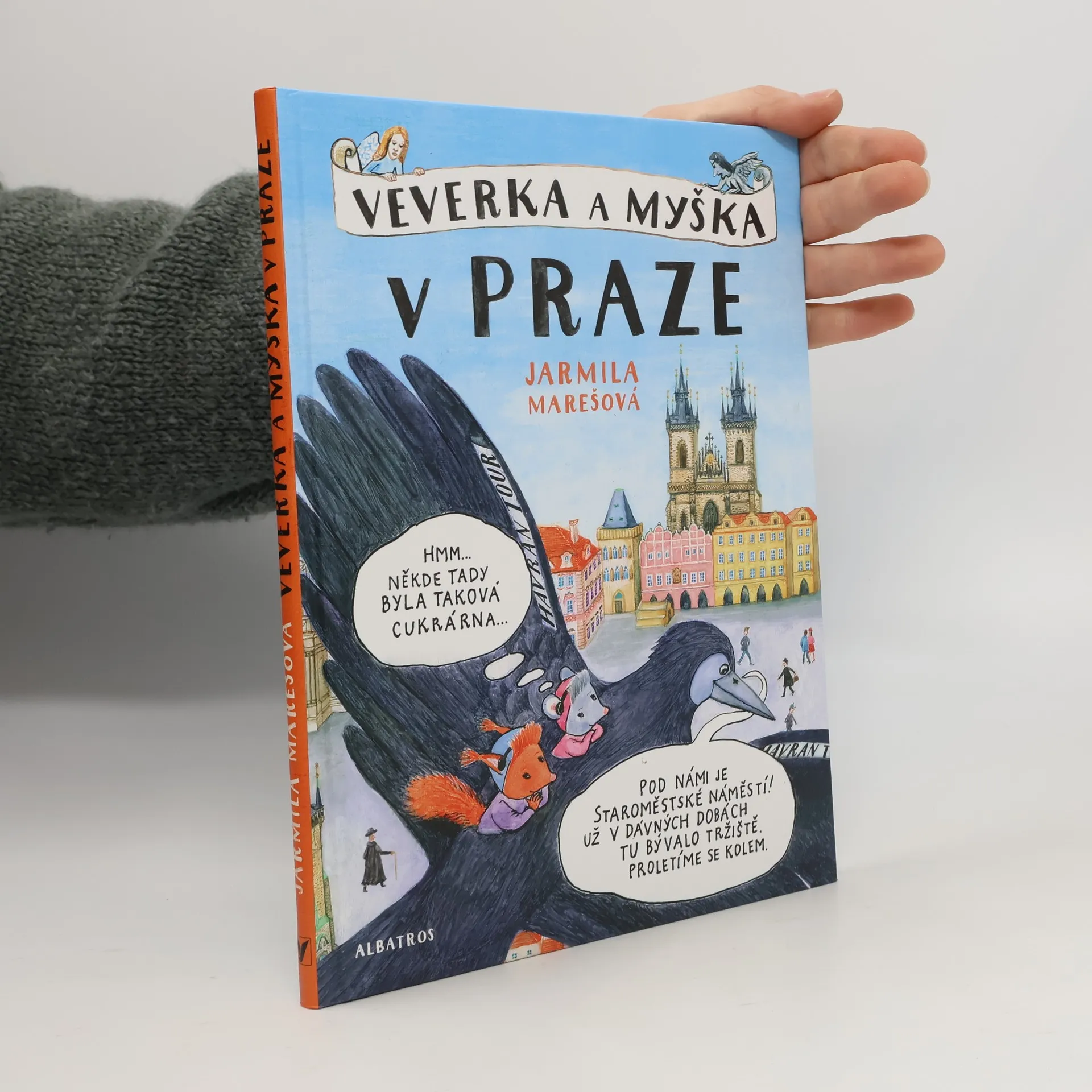 Komiksový průvodce Prahou Veverka s Myškou jsou zvědavé a trochu hubaté kamarádky. Vydaly se za babičkou do Prahy a krásy města objevují s cestovní kanceláří pana Havrana. Obletí s ním nejvýznamnější památky, a protože Havran umí krásně vyprávět, stane se z poznávání dějin úžasné dobrodružství a velká legrace. Cestovatelky na vlastní kožíšky poznají, jak lidé kdysi žili (navštíví třeba alchymistickou dílnu), a poslechnou si i tajuplné pražské legendy. Držte si čepice, odlétáme!
