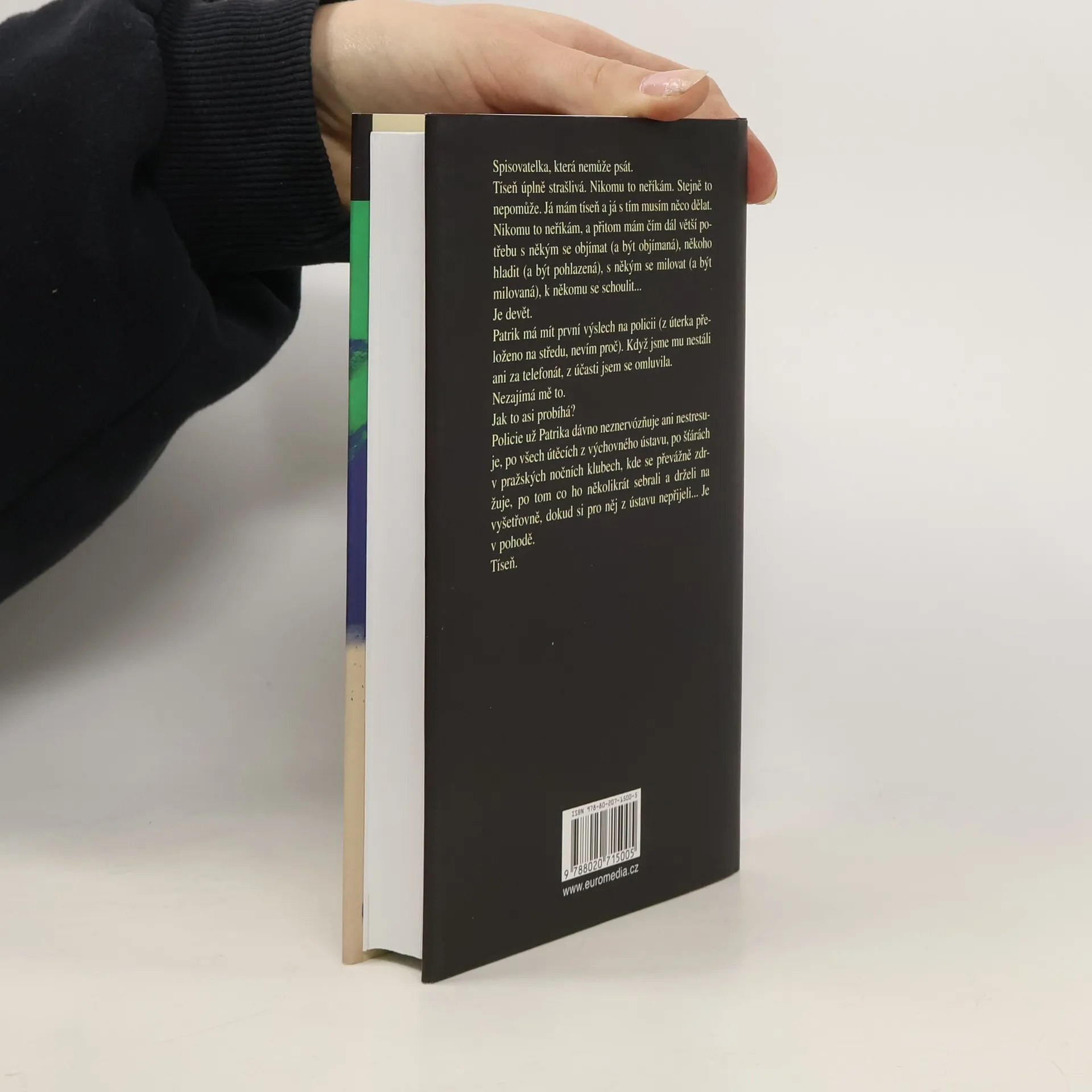 Spisovatelka, která nemůže psát. Tíseň úplně strašlivá. Nikomu to neříkám. Stejně to nepomůže. Já mám tíseň a já s tím musím něco dělat. Nikomu to neříkám a přitom mám čím dál větší potřebu s někým se objímat (a být objímaná), někoho hladit (a být pohlazená), s někým se milovat (a být milovaná), k někomu se schoulit... Je devět. Patrik má mít první výslech na policii (z úterka přeloženo na středu, nevím proč). Když jsme mu nestáli ani za telefonát, z účasti jsem se omluvila. Nezajímá mě to. Jak to asi probíhá? Policie už Patrika dávno neznervózňuje ani nestresuje, po všech útěcích z výchovného ústavu, po šťárách v pražských nočních klubech, kde se převážně zdržuje, po tom, co ho několikrát sebrali a drželi na vyšetřovně, dokud si pro něj z ústavu nepřijeli... Je v pohodě. Tíseň.