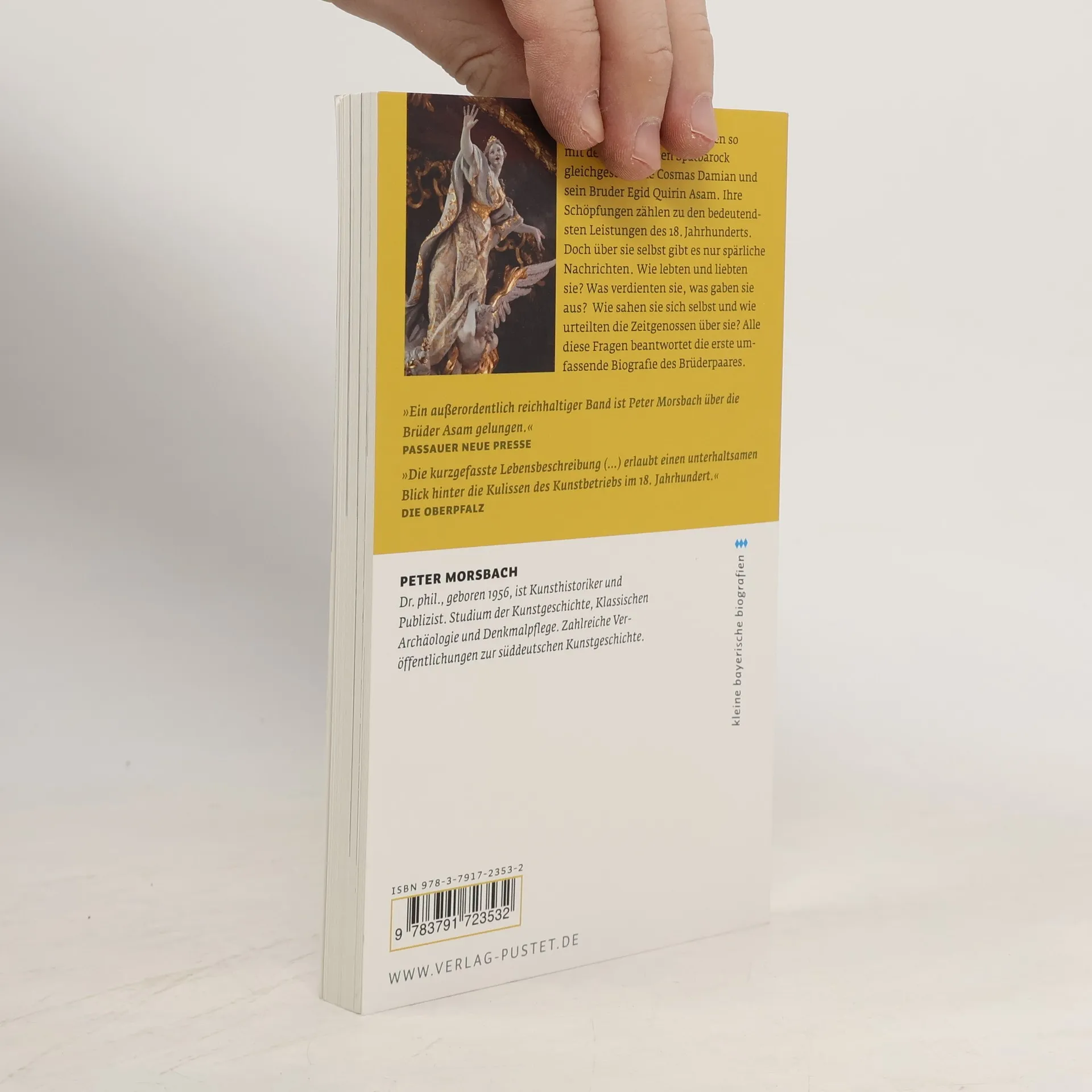 „Ein außerordentlich reichhaltiger Band ist Peter Morsbach über die Brüder Asam gelungen.“ PASSAUER NEUE PRESSE „Die kurzgefasste Lebensbeschreibung (…) erlaubt einen unterhaltsamen Blick hinter die Kulissen des Kunstbetriebs im 18. Jahrhundert.“ DIE OBERPFALZ Keine anderen Künstler werden so mir dem bayerischen Spätbarock gleichgeSetzt wie Cosmas Damian und Egid Quirin Asam. Ihre Schöpfungen zählen zu den bedeutendsten Leistungen der Kunst des 18. Jahrhunderts. Doch über sie selbst gibt es nur spärliche Nachrichten. Wie lebten und liebten sie? Was verdienten sie, was gaben sie aus? Wie war das Verhältnis zu ihren Arbeitgebern? Wie sahen sie sich selbst und wie urteilten die Zeitgenossen über sie? All diese Fragen beantwortet die erste umfassende Biografie des Brüderpaares.