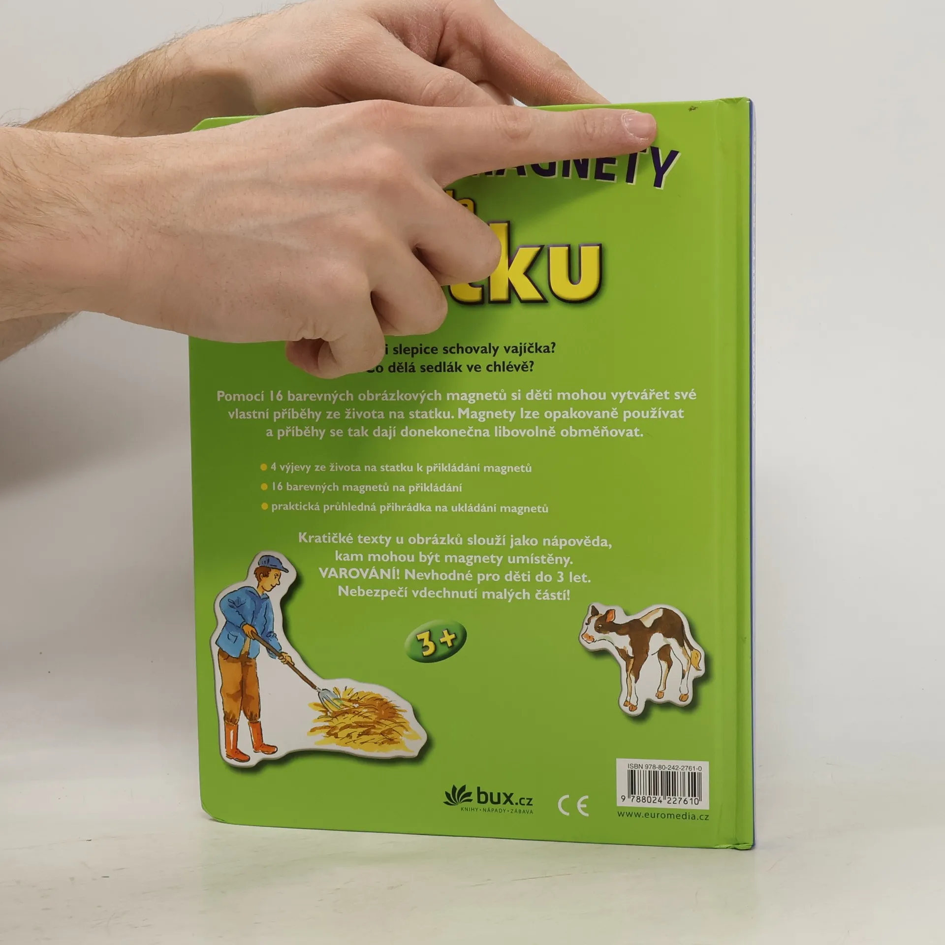 Kam si slepice schovaly vajíčka? Co dělá sedlák ve chlévě? Pomocí barevných obrázkových magnetů si děti mohou vytvářet své vlastní příběhy ze života na statku. Magnety lze opakovaně používat a příběhy se tak dají donekonečna libovolně obměňovat. Kratičké texty u obrázků slouží jako nápověda, kam mohou být magnety umístěny.