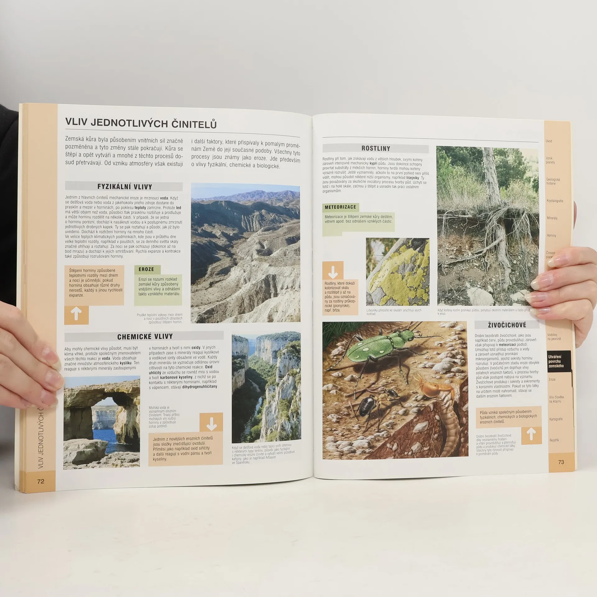 Tento přehled nabitý informacemi popisuje prostřednictvím účelné kombinace textu, barevných fotografií a názorných ilustrací suchozemské i vodní útvary a prvky planety Země. Vysvětluje činnost a působení tektonických desek a vznik jednotlivých světadílů a zabývá se i popisem horninotvorných a dalších geologických jevů, sopečné činnosti a klimatologie. V dalších kapitolách je vysvětleno moderní vědecké předpovídání počasí, popsány formy života v mořích a oceánech a shrnuto přírodní utváření povrchu Země spolu s vlivy pohoří, řek, ledovců, pouští i deštných pralesů. Závěrečné kapitoly pojednávají o vlivu člověka na planetu a věnují se stručné historii kartografie. Díky stovkám barevných fotografií a ilustrací kombinovaných s výstižnými popisnými texty bude tato kniha vhodným obohacením domácích knihoven i učeben.