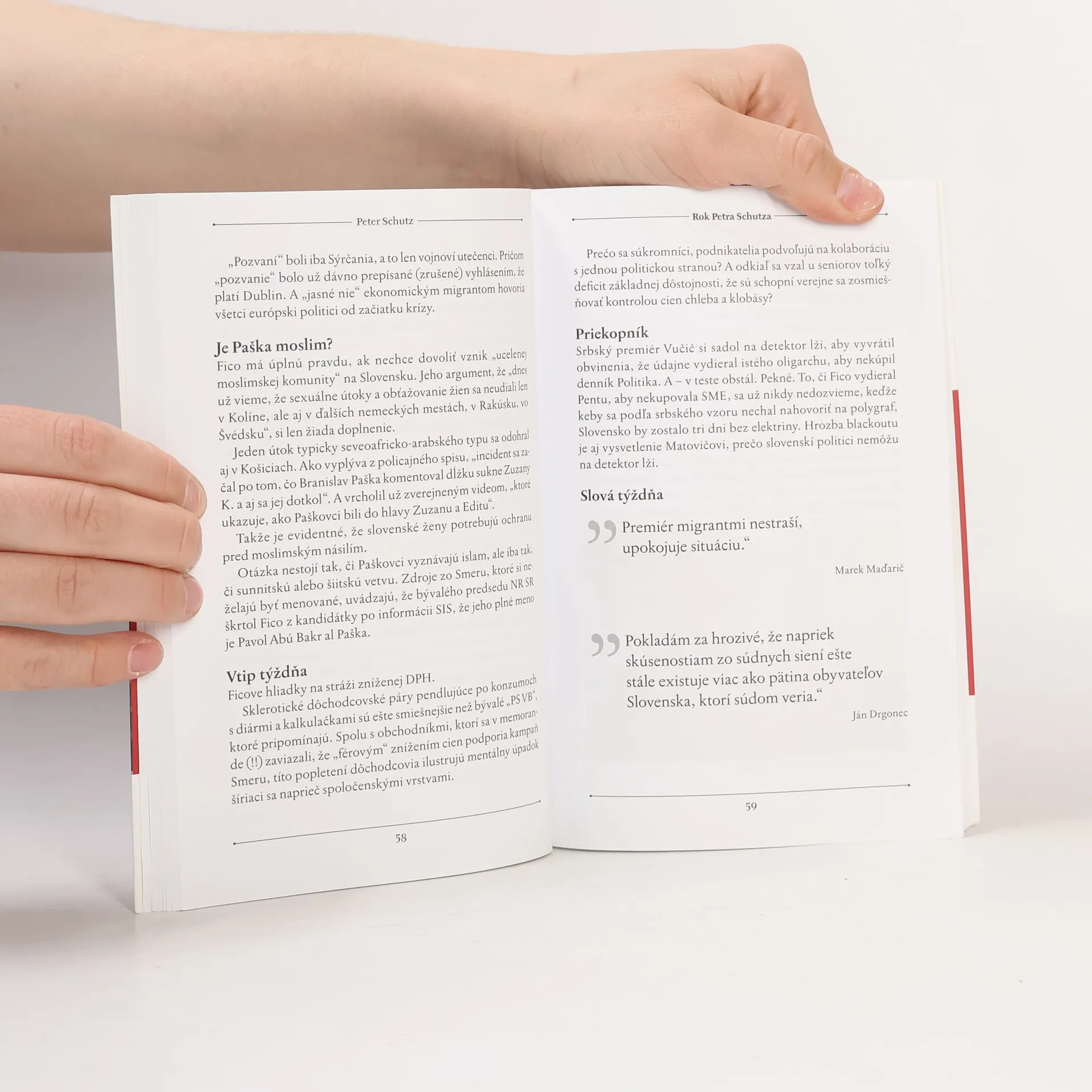 Novinár denníka SME Peter Schutz si vo svojich článkoch nekladie servítku pred ústa. Výber jeho denných a týždenných komentárov neznehodnotil čas, lebo sú presné, majú svoju energiu a je v nich neodolateľný humor. Jeho kniha je naplnená nielen veľkými udalosťami, ale aj drobnými postrehmi na tému, ako si tu žijeme.