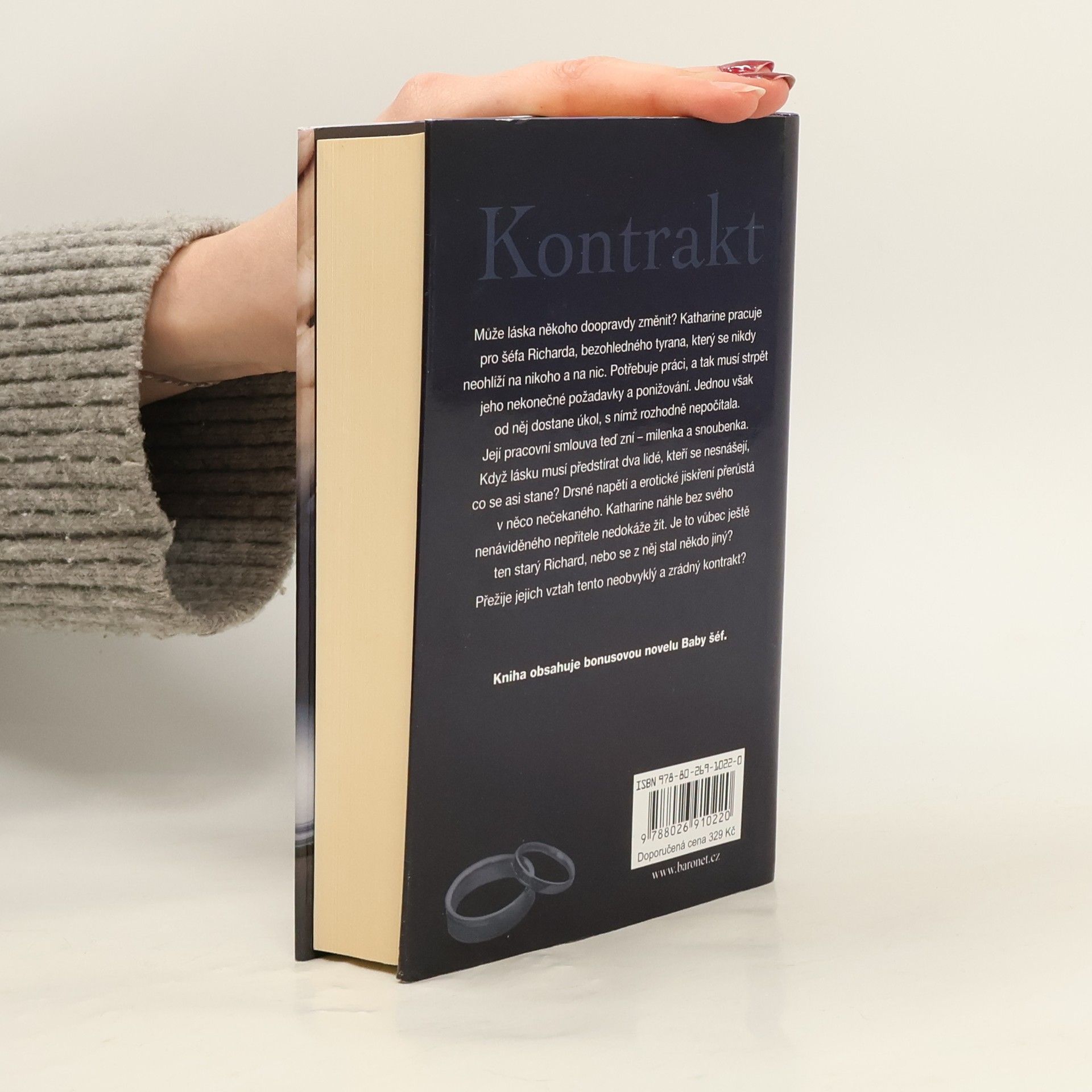 Může láska někoho doopravdy změnit? Katharine pracuje pro šéfa Richarda, bezohledného tyrana, který se nikdy neohlíží na nikoho a na nic. Potřebuje práci, a tak musí strpět jeho nekonečné požadavky a ponižování. Jednou však od něj dostane úkol, s nímž rozhodně nepočítala. Její pracovní smlouva teď zní – milenka a snoubenka. Když lásku musí předstírat dva lidé, kteří se nesnášejí, co se asi stane? Drsné napětí a erotické jiskření přerůstá do něčeho nečekaného. Katharine náhle bez svého nenáviděného nepřítele nedokáže žít. Je to vůbec ještě ten starý Richard, nebo se z něj stal někdo jiný? Přežije jejich vztah tento neobvyklý a zrádný kontrakt? Kniha obsahuje bonusovou novelu Baby šéf.