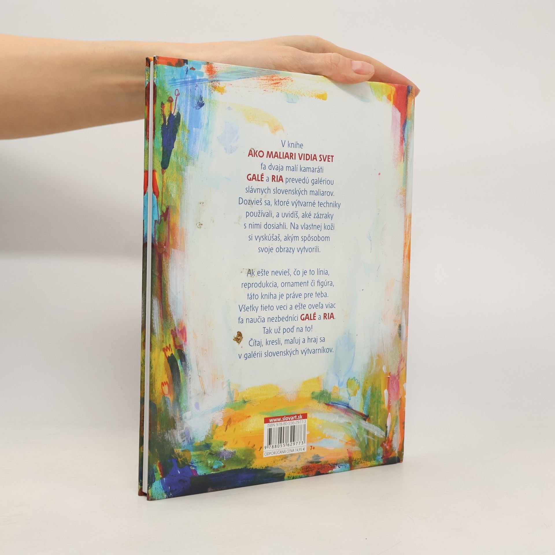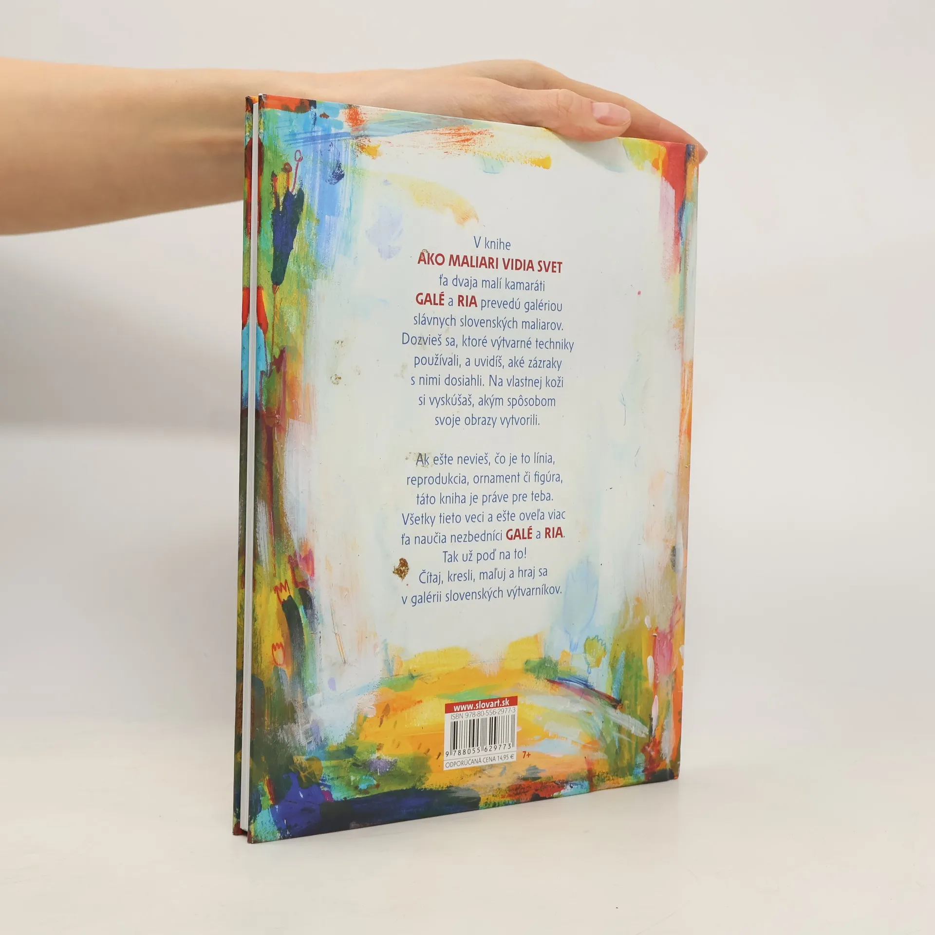V knihe Ako maliari vidia svet prevedú kamaráti GALÉ a RIA galériou slávnych slovenských maliarov všetky deti. Naučia sa, ktoré výtvarné techniky používali, a uvidia, aké zázraky s nimi dosiahli. Na vlastnej koži si naši malí umelci môžu vyskúšať, akým spôsobom slávni maliari svoje diela vytvorili. Ak ešte neviete, čo je to línia, reprodukcia, ornament či figúra, a pritom máte kreslenie zo všetkého najradšej, táto kniha je presne pre vás. Všetky tieto veci a ešte oveľa vás naučia nezbedníci GALÉ a RIA. Tak už poďme nato! Čítajte, kreslite, maľujte a hrajte sa v galérii slovenských výtvarníkov.