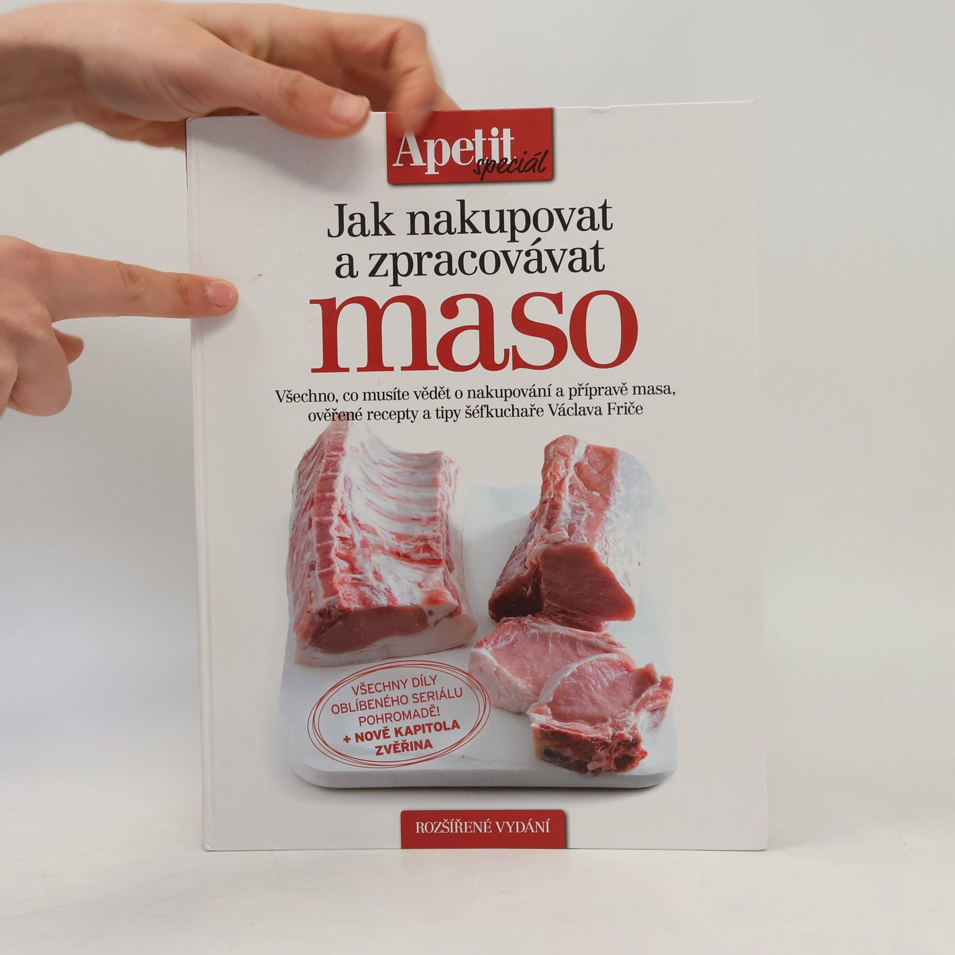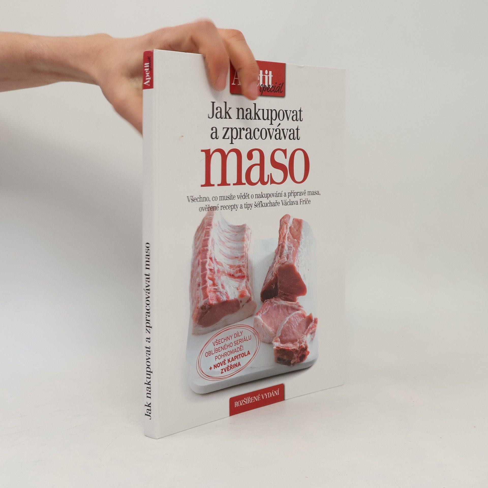 Všechno, co musíte vědět o nakupování a přípravě masa. Ověřené recepty a tipy šéfkuchaře Václava Friče. Rozšířené vydání. Měsíc co měsíc, téměř tři roky jsme v Apetitu připravovali seriál o tom, jak nakupovat a zpracovávat maso, který uváděl šéfkuchař Václav Frič, známý svou specializací na maso a klasickou českou kuchyni. Na 180 stranách vám nabízíme všech 34 dílů populárního seriálu pohromadě a nově ještě kapitolu věnovanou zvěřině. Provedeme vás v nich nákupem vepřového, hovězího, telecího a jehněčího masa a zvěřiny a představíme vám i poklady, které před vámi doposud řezníci tajili. K tomu přidáme návod, jak vše zužitkovat na maximum, a samozřejmě i oblíbené recepty. S námi si návštěvu řeznictví i vaření užijete!