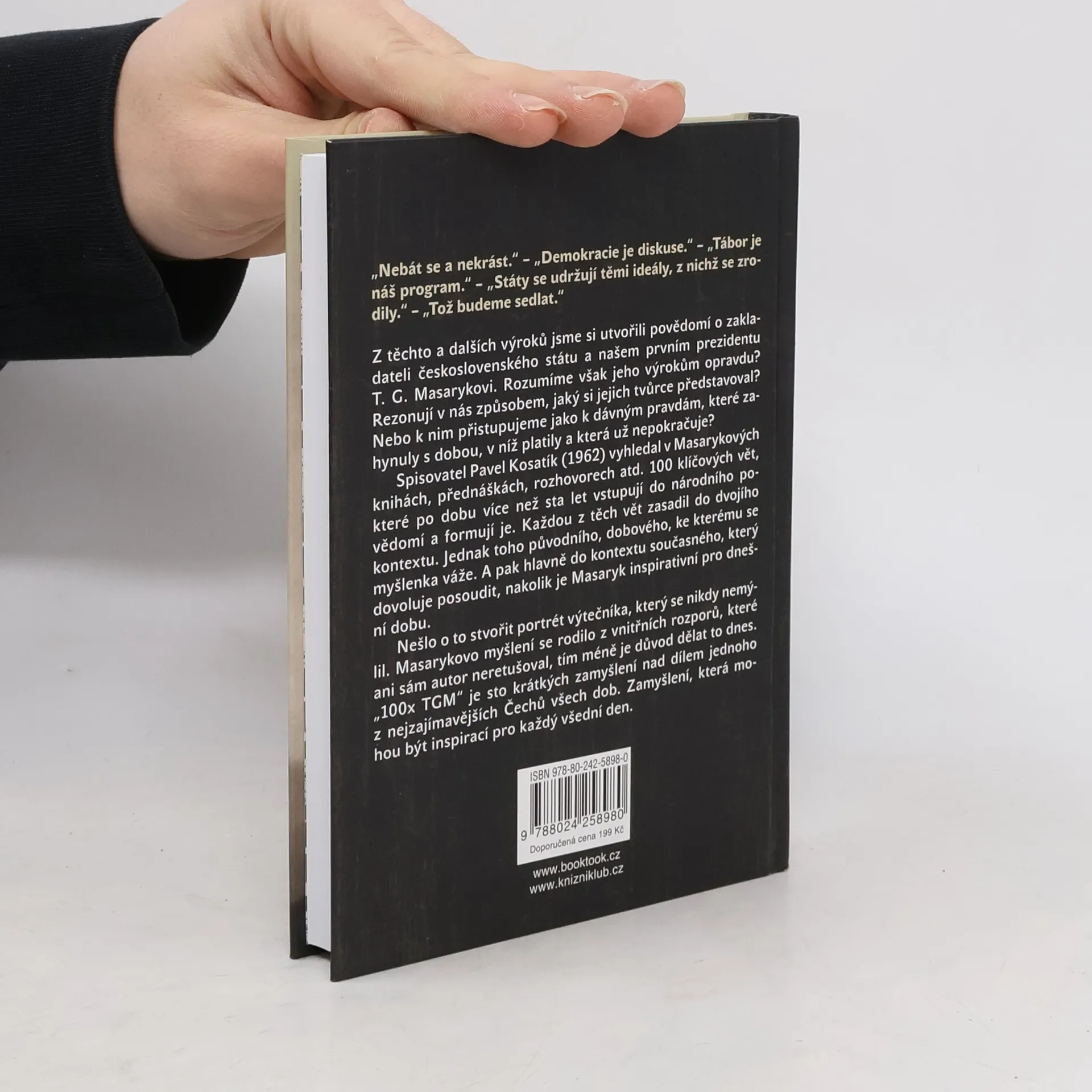 100 moudrých i vtipných, slavných i neznámých, ale vždy zajímavých výroků T. G. Masaryka, které mohou být užitečné a posloužit k zamyšlení i v současnosti. Malá čítanka Masarykových výroků s komentářem a výkladem, která TGM přibližuje dnešním čtenářům.
