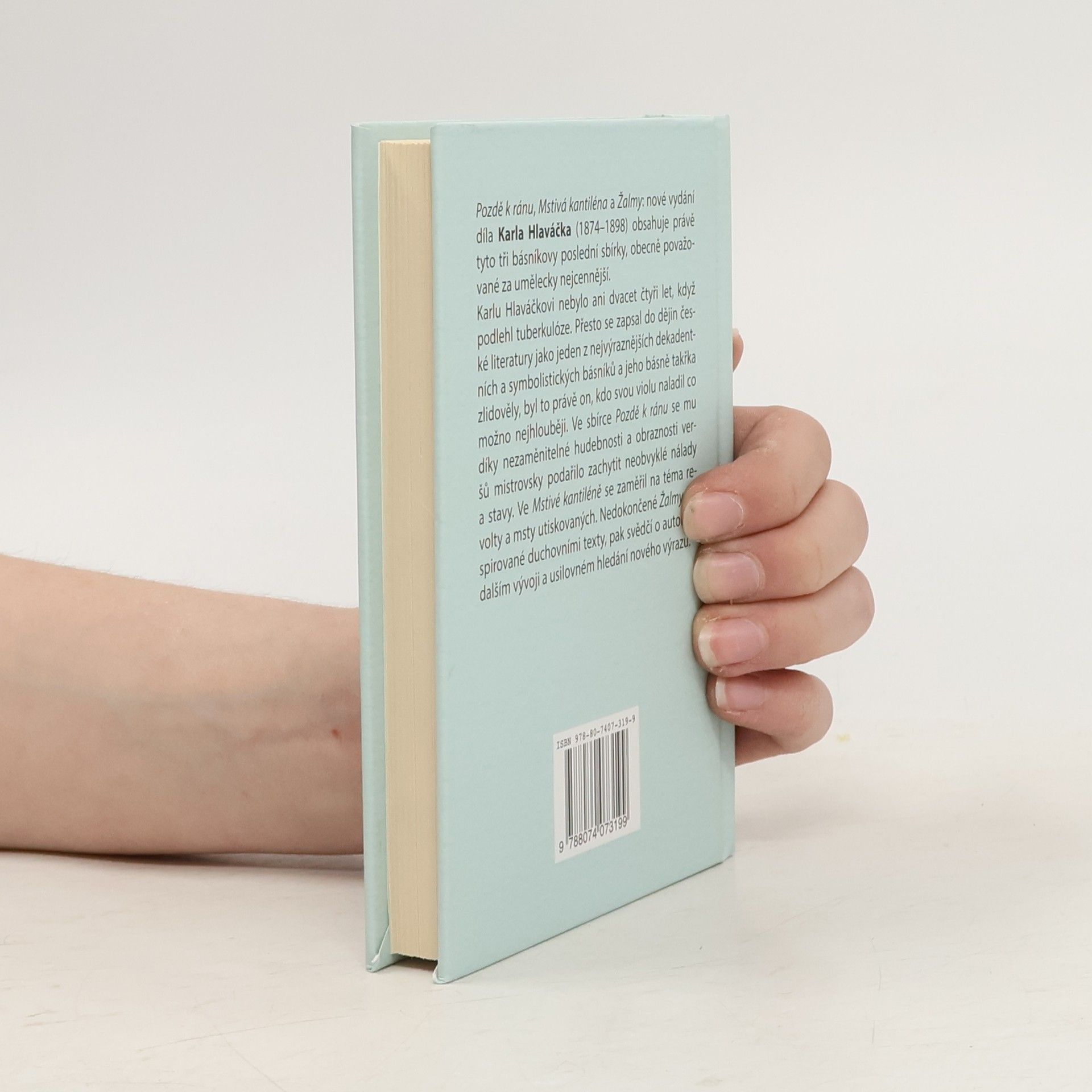 Pozdě k ránu, Mstivá kantiléna a Žalmy: nové vydání díla Karla Hlaváčka (1874-1898) obsahuje právě tyto tři básníkovy poslední sbírky, obecně považované za umělecky nejcennější. Karlu Hlaváčkovi nebylo ani dvacet čtyři let, když podlehl tuberkulóze. Přesto se zapsal do dějin české literatury jako jeden z nejvýraznějších dekadentních a symbolistických básníků a jeho básně takřka zlidověly, byl to právě on, kdo svou violu naladil co možno nejhlouběji. Ve sbírce Pozdě k ránu se mu díky nezaměnitelné hudebnosti a obraznosti veršů mistrovsky podařilo zachytit neobvyklé nálady a stavy. Ve Mstivé kantiléně se zaměřil na téma revolty a msty utiskovaných. Nedokončené Žalmy, inspirované duchovními texty, pak svědčí o autorově dalším vývoji a usilovném hledání nového výrazu.