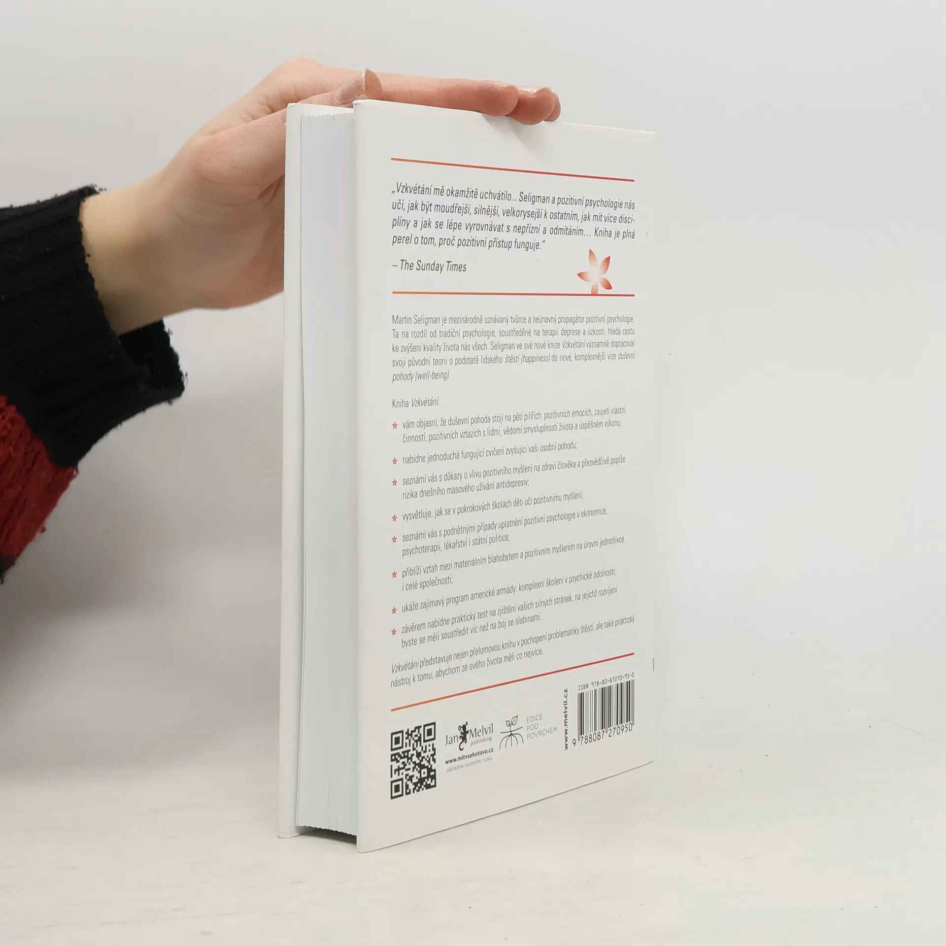 Nové poznatky o podstatě štěstí a duševní pohody Kniha Vzkvétání — Nové poznatky o podstatě štěstí a duševní pohody navazuje na přelomové práce Dr. Martina Seligmana v oblasti optimismu, motivace a lidského charakteru a ukazuje nám, jak ze svého života získat co nejvíce: odhaluje vzrušující novou teorii o tom, co tvoří „dobrý život“ – pro jednotlivce, pro komunity a pro celé národy. Ve fascinující kombinaci vědeckých poznatků a praxe vystihuje kniha Vzkvétání skvěle záměr i obsah pozitivní psychologie. Štěstí samotné, přestože je důležitou součástí osobní pohody, nedává životu člověka úplný a pravý smysl. Seligman nyní klade otázku: Co je tím, co vám umožňuje kultivovat svá nadání, vytvářet hlubší a trvalejší vztahy s ostatními lidmi, cítit radost a smysluplně přispívat světu? Neboli: co je tím, díky čemu můžete prospívat? Do centra zájmu se dostává osobní pohoda (well-being), přičemž štěstí (happiness) neboli pozitivní emoce se stávají jedním z pěti pilířů pozitivní psychologie, spolu se zaujetím, pozitivními vztahy, smysluplností a úspěšným výkonem. Těchto pět prvků, pro které se používá akronym PERMA (z anglických termínů Positive Emotions, Engagement, Relationship, Meaning, Accomplishment), představuje permanentní, trvalé stavební kameny plně uspokojivého života.
