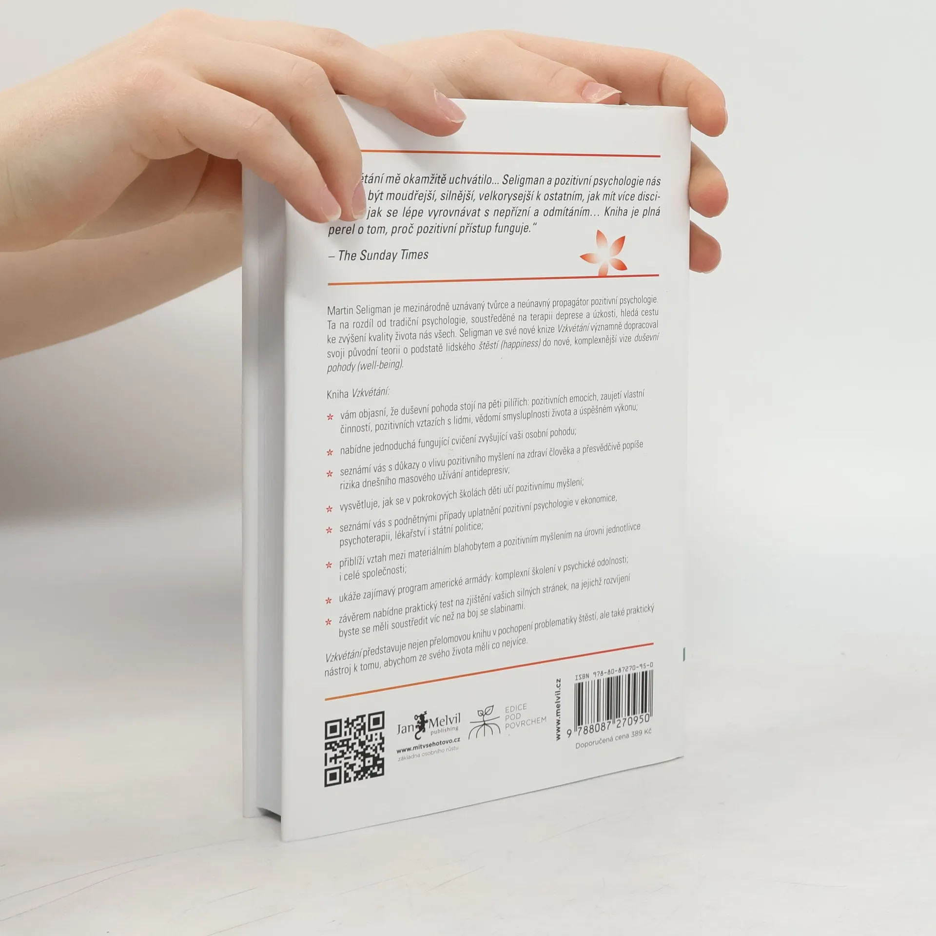 Nové poznatky o podstatě štěstí a duševní pohody Kniha Vzkvétání — Nové poznatky o podstatě štěstí a duševní pohody navazuje na přelomové práce Dr. Martina Seligmana v oblasti optimismu, motivace a lidského charakteru a ukazuje nám, jak ze svého života získat co nejvíce: odhaluje vzrušující novou teorii o tom, co tvoří „dobrý život“ – pro jednotlivce, pro komunity a pro celé národy. Ve fascinující kombinaci vědeckých poznatků a praxe vystihuje kniha Vzkvétání skvěle záměr i obsah pozitivní psychologie. Štěstí samotné, přestože je důležitou součástí osobní pohody, nedává životu člověka úplný a pravý smysl. Seligman nyní klade otázku: Co je tím, co vám umožňuje kultivovat svá nadání, vytvářet hlubší a trvalejší vztahy s ostatními lidmi, cítit radost a smysluplně přispívat světu? Neboli: co je tím, díky čemu můžete prospívat? Do centra zájmu se dostává osobní pohoda (well-being), přičemž štěstí (happiness) neboli pozitivní emoce se stávají jedním z pěti pilířů pozitivní psychologie, spolu se zaujetím, pozitivními vztahy, smysluplností a úspěšným výkonem. Těchto pět prvků, pro které se používá akronym PERMA (z anglických termínů Positive Emotions, Engagement, Relationship, Meaning, Accomplishment), představuje permanentní, trvalé stavební kameny plně uspokojivého života.