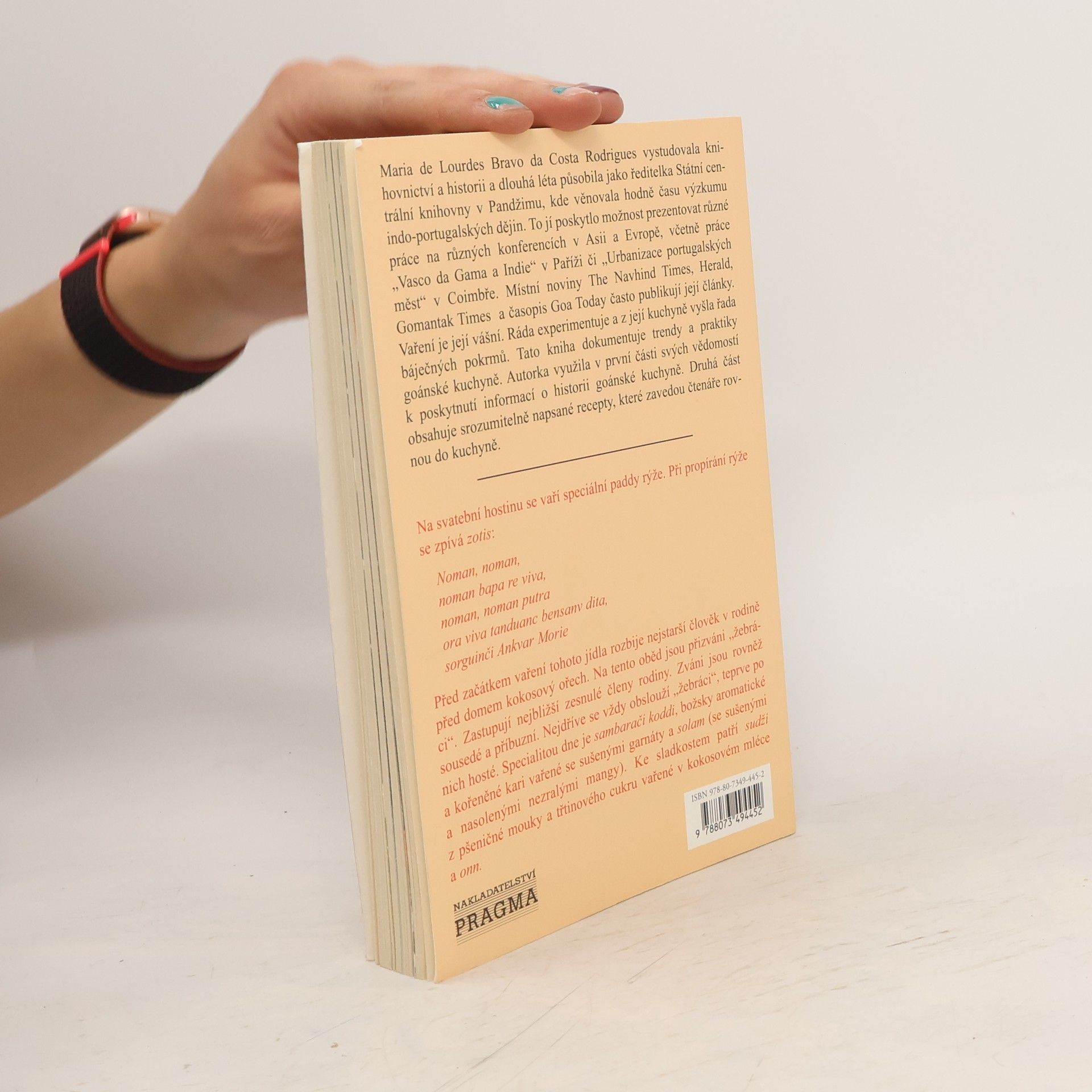 Goánská kuchyně je neobyčejnou kombinací indické, portugalské a muslimské kultury. Autorka nabízí nejen recepty na lahodná a zdravá jídla, ale též pohled na historii utváření tohoto regionu, jeho obyvatel a kuchyně. Provede vás nepřebernými druhy koření a doporučí, k čemu jsou vhodné. Odhalte další dílek světové gastronomie!
