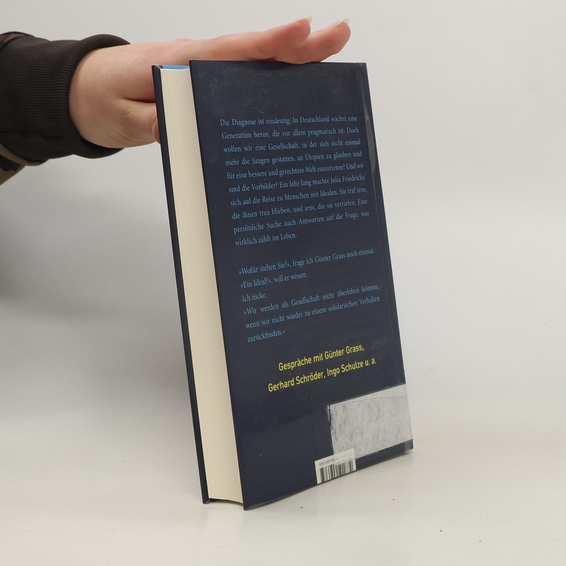 Die Diagnose der Sozialforscher ist eindeutig: In Deutschland wächst eine Generation heran, die vor allem pragmatisch ist. Doch wollen wir eine Gesellschaft, in der sich nicht einmal mehr die Jungen gestatten, an Utopien zu glauben und für eine bessere und gerechtere Welt einzutreten? Und wo sind die Vorbilder? Ein Jahr lang machte Julia Friedrichs sich auf die Suche nach Menschen mit Idealen. Sie traf jene, die ihnen treu blieben, und jene, die sie verrieten. Ihre Reise führte sie in die Büros von Gerhard Schröder und Peter Hartz; aber auch zu Nichtprominenten, die jenseits des Rampenlichts an der Verwirklichung ihrer Ideen arbeiten. Eine persönliche Suche nach Antworten auf die Frage, was wirklich zählt im Leben.