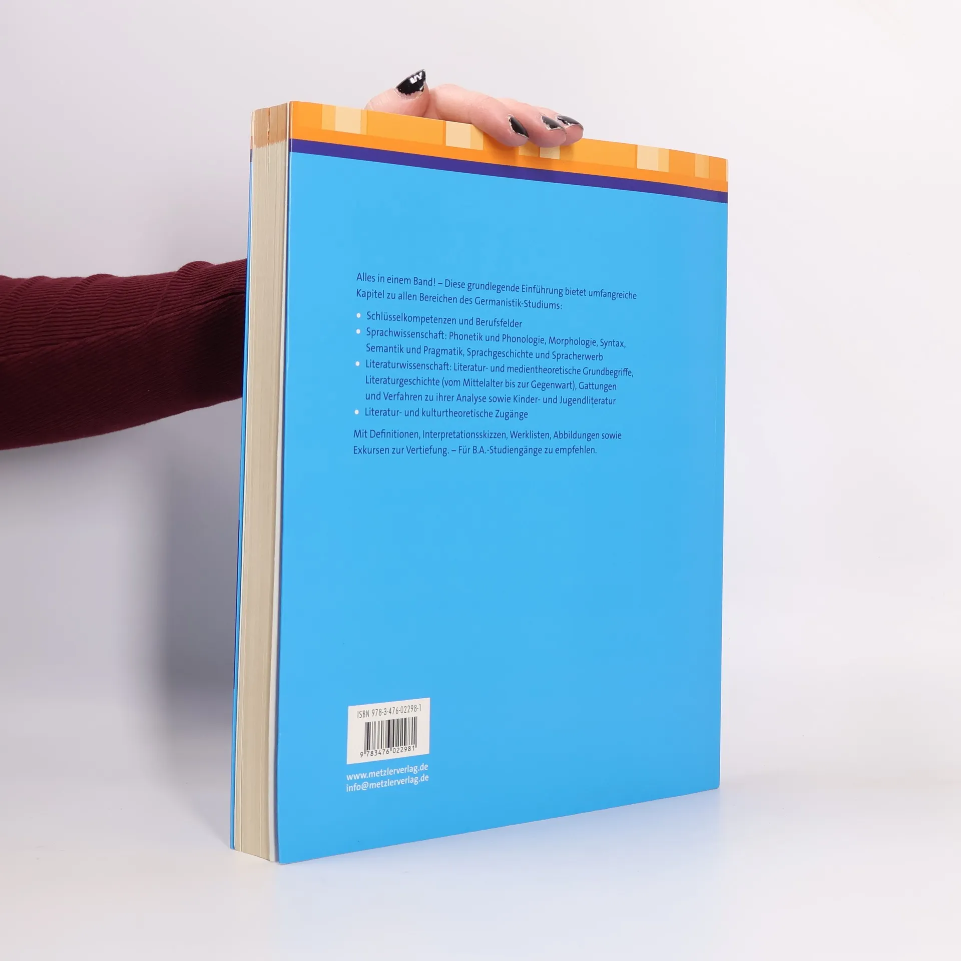 Germanistik auf einen Blick. Wer sich einen fundierten Überblick über die Inhalte des Germanistikstudiums verschaffen möchte, liegt mit diesem Werk genau richtig. Alle Teilbereiche der Sprach- und Literaturwissenschaft inklusive der älteren Sprache und Literatur werden ausführlich vorgestellt. Zu den Themen gehören u. a.: Grammatik, Semantik, Sprachgeschichte und -erwerb, Gattungen, Literaturgeschichte und -theorie. Ein Praxisteil beschreibt das wissenschaftliche Arbeiten und geht auf zu erwerbende Kompetenzen ein. Optimal auf das BA-Studium zugeschnitten.