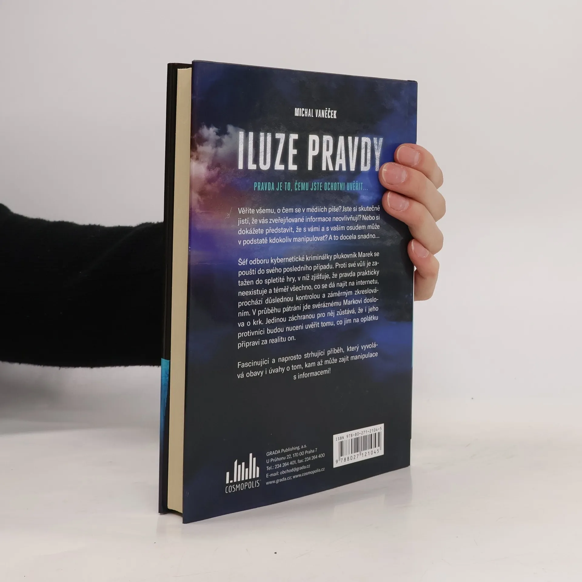 Strhující thriller z nedaleké budoucnosti. Šéf odboru kybernetické kriminálky, plukovník Marek, se chystá na odchod do penze. Těší se na klidné časy na svém statku v Posázaví. Před odchodem na odpočinek si nechá ještě odoperovat koleno u svého kamaráda ze studií. V nemocnici se však dějí podivné věci. Dojde k náhlému výpadku elektřiny, následně Marek dostává jiné prášky, než má. Poněkud zvláštním způsobem jej kontaktuje bývalá vedoucí oddělení informačního systému. Marek je proti své vůli zatažen do spletité hry, v níž zjišťuje, že pravda prakticky neexistuje, že téměř všechno, co se dá najít na internetu, prochází důslednou kontrolou a zejména úpravami a zkreslováním. Zjišťuje, že pravda je pouze to, čemu jsou lidé ochotni uvěřit. Pouští se do posledního pátrání ve svém životě, kde jde jemu i poněkud excentrické šéfce nemocničního IT doslova o krk. Jedinou záchranou pro ně zůstává, že i jejich protivníci budou nuceni uvěřit tomu, co jim tito dva profesionálové připraví za realitu. Příběh se odehrává v neurčitě nedaleké budoucnosti a vyvolává úvahy i obavy o tom, kam až může zajít manipulace s informacemi.