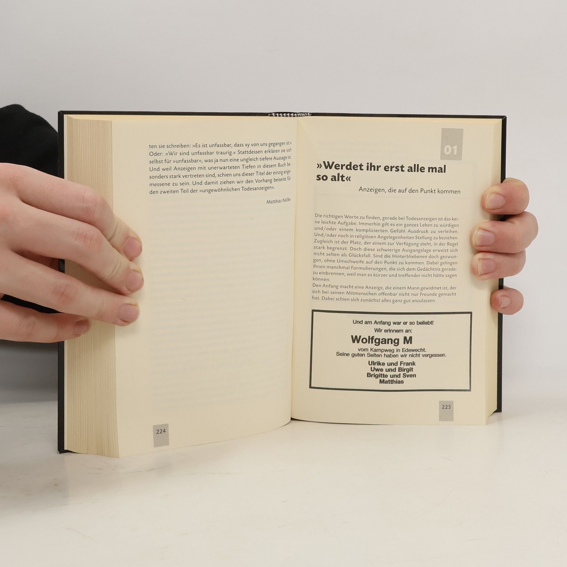 'Wer nicht stirbt, hat nie gelebt!', so heißt es in einer Todesanzeige. Wie wahr! Und trotz des traurigen Anlasses ihrer Entstehung sind viele 'Nachrufe' mitunter äußerst skurrile, bisweilen rätselhafte Nachrichten, die mal komisch, mal bizarr, aber immer mit großem Gefühl Auskunft geben über das Leben der oder des Verstorbenen. Dieses Buch enthält eine Sammlung der kuriosesten und amüsantesten Fundstücke dieses 'Genres', die ein spannendes und facettenreiches Bild vom Leben und Sterben in unserem Land zeichnen. Und das Wichtigste dabei: Am Ende darf gelacht werden!