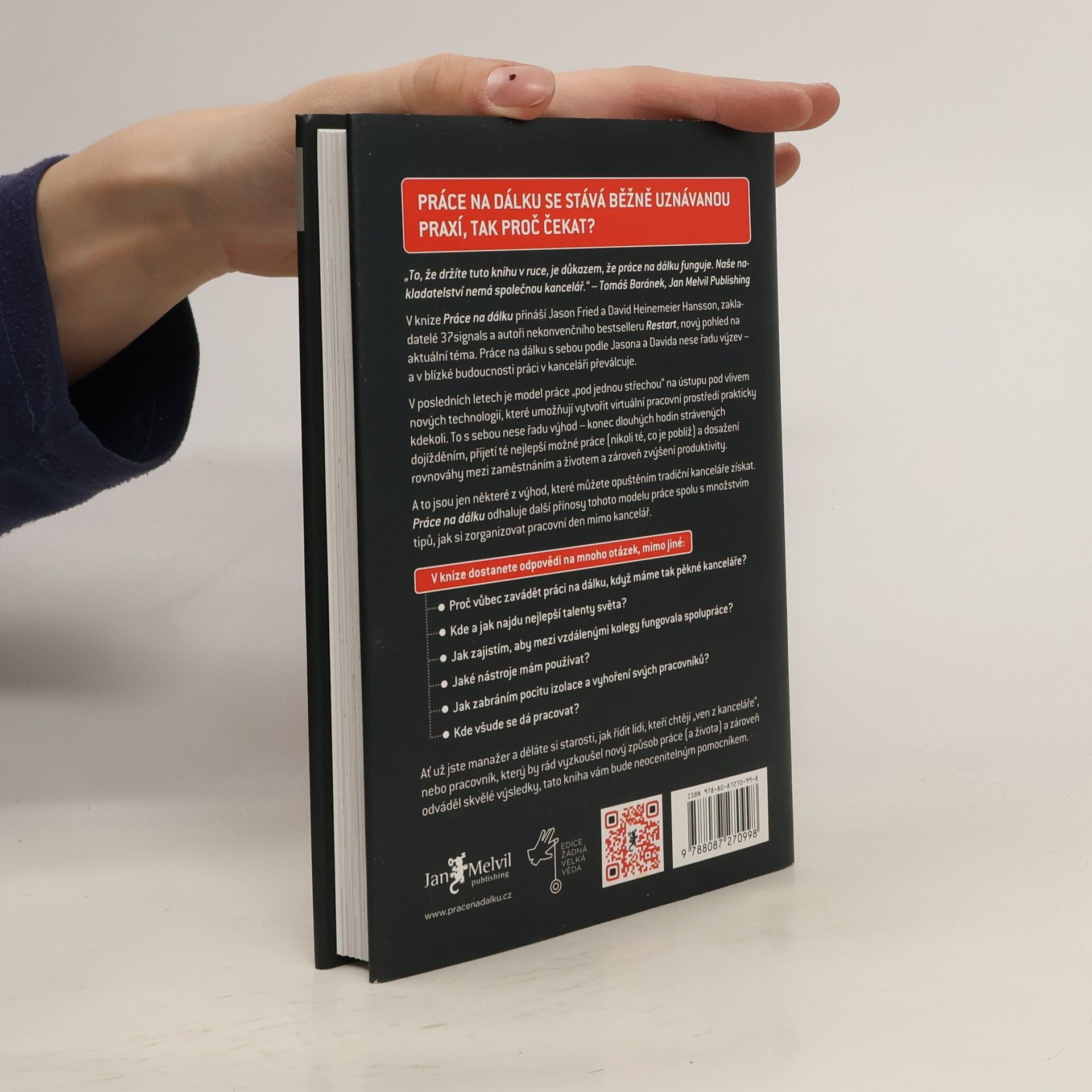 Zn: Kancelář zbytečná. V knize Práce na dálku přináší Jason Fried a David Heinemeier Hansson, zakladatelé 37signals a autoři nekonvenčního bestselleru Restart, nový pohled na aktuální téma. Práce na dálku s sebou podle Jasona a Davida nese řadu výzev - a v blízké budoucnosti práci v kanceláři převálcuje. V posledních letech je model práce "pod jednou střechou" na ústupu pod vlivem nových technologií, které umožňují vytvořit virtuální pracovní prostředky prakticky kdekoli.