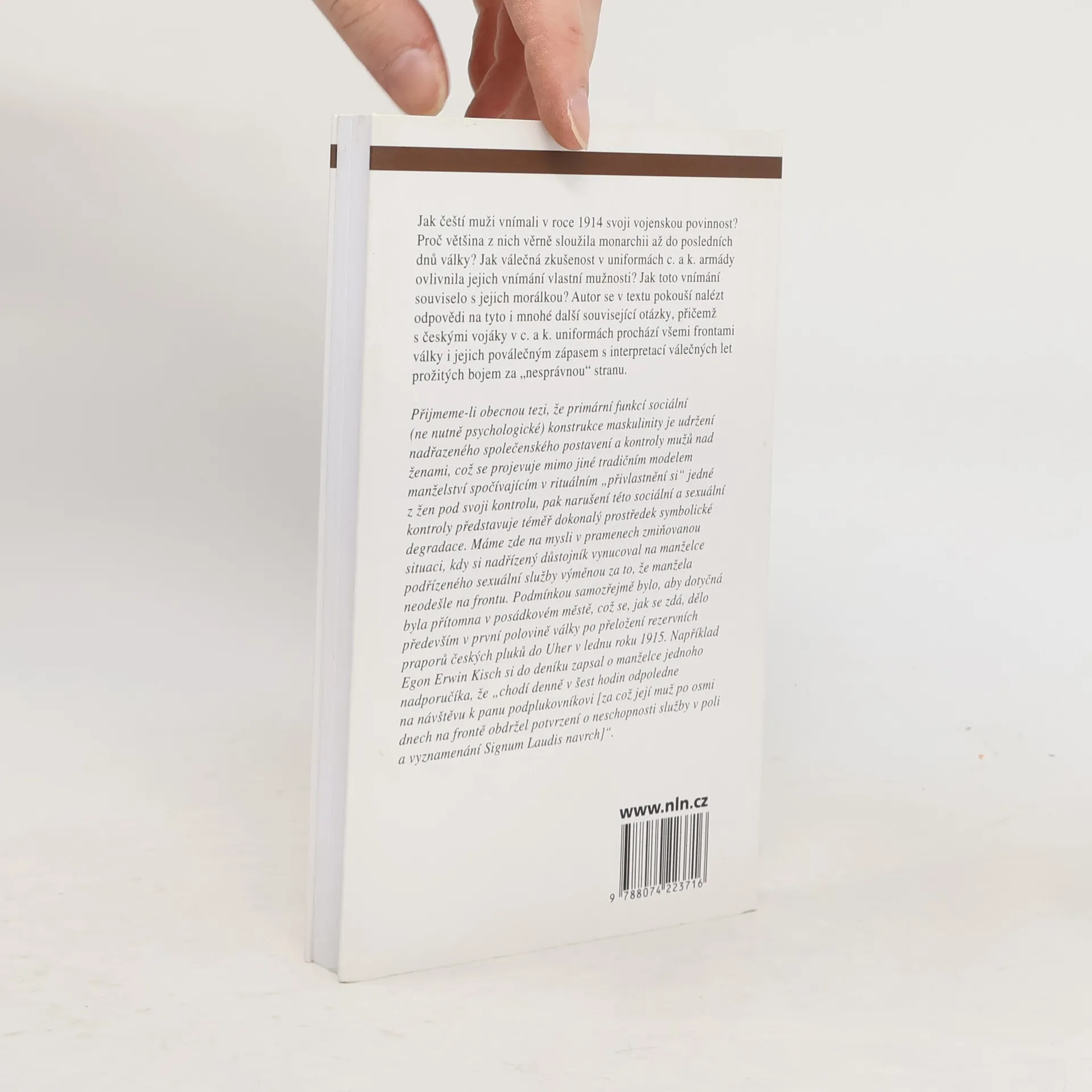 Motivace, morálka a mužnost českých vojáků Velké války 1914–1918. Jak čeští muži vnímali v roce 1914 svoji vojenskou povinnost? Proč většina z nich věrně sloužila monarchii až do posledních dnů války? Jak válečná zkušenost v uniformách c. a k. armády ovlivnila jejich vnímání vlastní mužnosti? Jak toto vnímání souviselo s jejich morálkou? Autor se v textu pokouší nalézt odpovědi na tyto i mnohé další související otázky, přičemž s českými vojáky v c. a k. uniformách prochází všemi frontami války i jejich poválečným zápasem s interpretací válečných let prožitých bojem za „nesprávnou“ stranu konfliktu.
