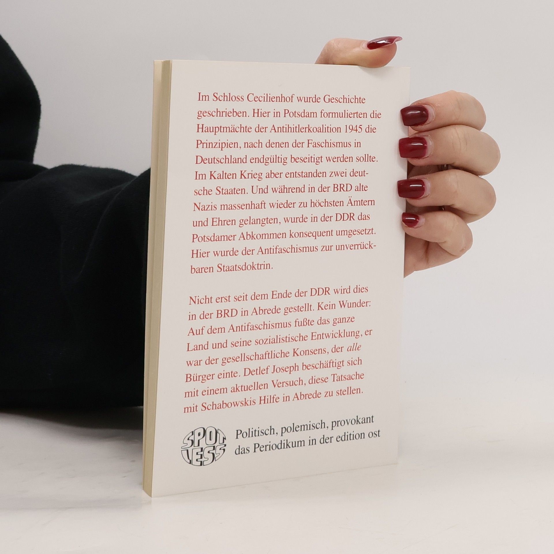 Im Schloss Cecilienhof wurde Geschichte geschrieben. In Potsdam formulierten die Hauptmächte der Antihitlerkoalition 1945 die Prinzipien, nach denen der Faschismus in Deutschland endgültig beseitigt werden sollte. Im Kalten Krieg aber entstanden zwei deutsche Staaten. Und während in der BRD alte Nazis massenhaft wieder zu höchsten Ämtern und Ehren gelangten, wurde in der DDR das Potsdamer Abkommen konsequent umgesetzt. Hier wurde der Antifaschismus zur Staatsdoktrin. Nicht erst seit dem Ende der DDR wird dies in der BRD bestritten. Kein Wunder: Auf dem Antifaschismus fußte das ganze Land und seine sozialistische Entwicklung, er war der gesellschaftliche Konsens, der alle Bürger einte. Detlef Joseph beschäftigt sich mit einem aktuellen Versuch, diese Tatsache mit Schabowskis Hilfe in Abrede zu stellen.