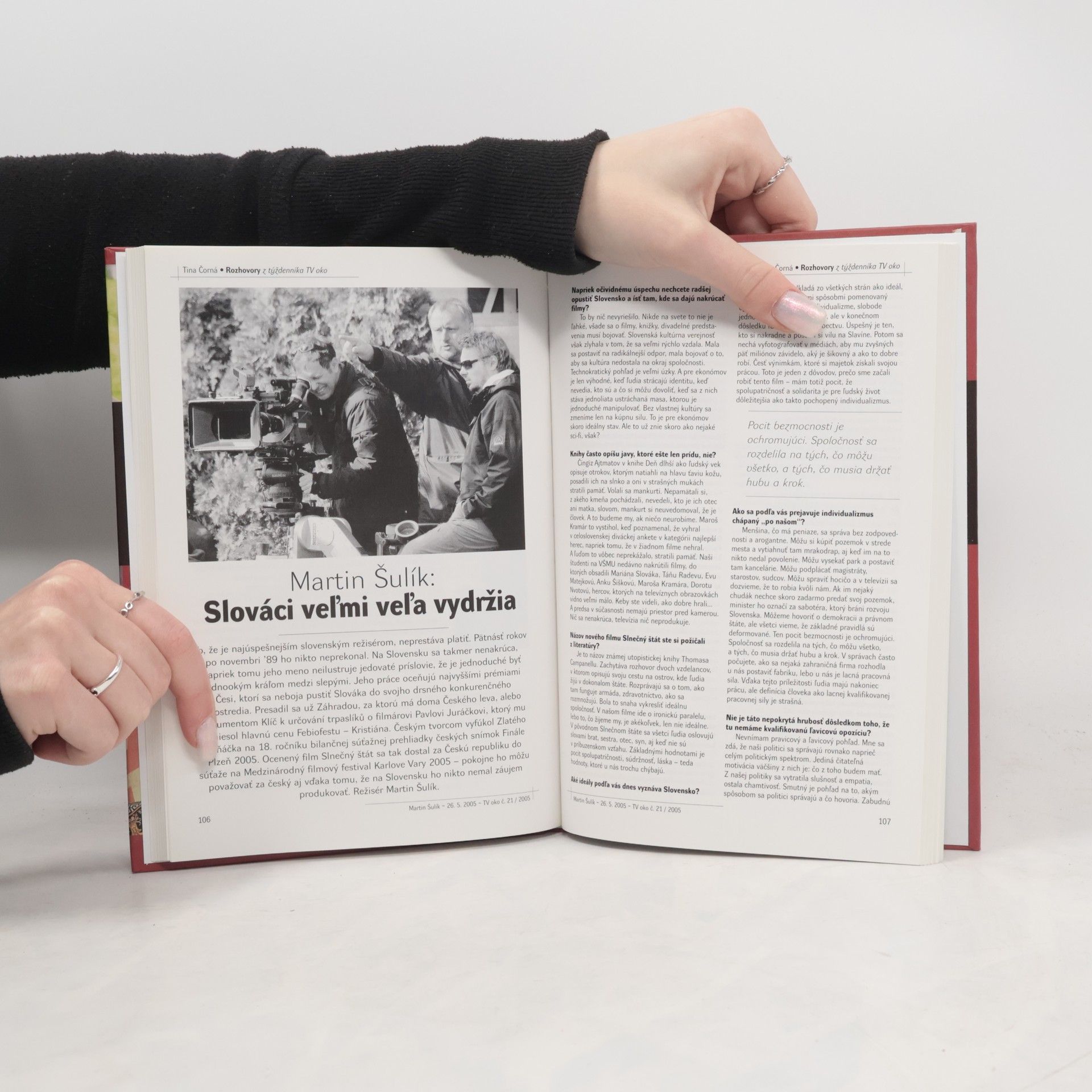 Výber najzaujímavejších rozhovorov z týždenníka TV oko. Václav Havel, Ján Čarnogurský, Marián Labuda, Bolek Polívka, Karel Schwarzenberg, Martin Huba, Lászlo Szigeti, Martin Šulík, Dušan Dušek, Fedor Gál... a... Tina Čorná. 35 výborných rozhovorov, ku ktorým sa oplatí vrátiť.
