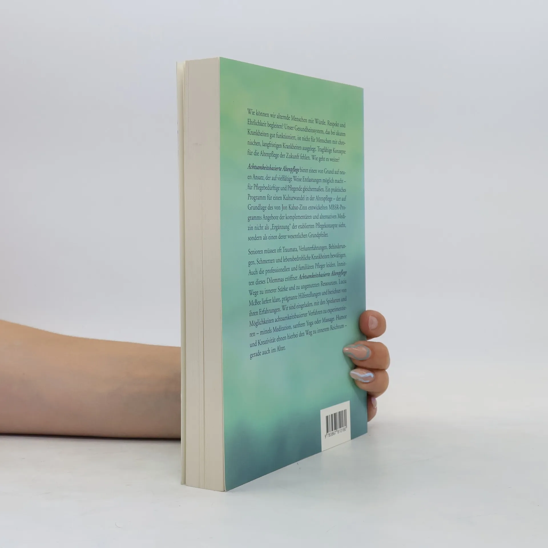 Wie können wir alternde Menschen mit Würde, Respekt und Ehrlichkeit begleiten? Unser Gesundheitssystem, das bei akuten Krankheiten gut funktioniert, ist nicht für Menschen mit chronischen, langfristigen Krankheiten ausgelegt. Tragfähige Konzepte für die Altenpflege der Zukunft fehlen. Wie geht es weiter? Achtsamkeitsbasierte Altenpflege bietet einen von Grund auf neuen Ansatz, der auf vielfältige Weise Entlastungen möglich macht – für Pflegebedürftige und Pflegende gleichermaßen. Ein praktisches Programm für einen Kulturwandel in der Altenpflege – der auf Grundlage des von Jon Kabat-Zinn entwickelten MBSR-Programms Angebote der komplementären und alternativen Medizin nicht als „Ergänzung“ der etablierten Pflegekonzepte sieht, sondern als einen derer wesentlichen Grundpfeiler. Senioren müssen oft Traumata, Verlusterfahrungen, Behinderungen, Schmerzen und lebensbedrohliche Krankheiten bewältigen. Auch die professionellen und familiären Pfleger leiden. Inmitten dieses Dilemmas eröffnet Achtsamkeitsbasierte Altenpflege Wege zu innerer Stärke und zu ungenutzten Ressourcen. Lucia McBee liefert klare, prägnante Hilfestellungen und berichtet von ihren Erfahrungen. Wir sind eingeladen, mit den Spielarten und Möglichkeiten achtsamkeitsbasierter Verfahren zu experimentieren – mittels Meditation, sanftem Yoga oder Massage. Humor und Kreativität ebnen hierbei den Weg zu innerem Reichtum – gerade auch im Alter.