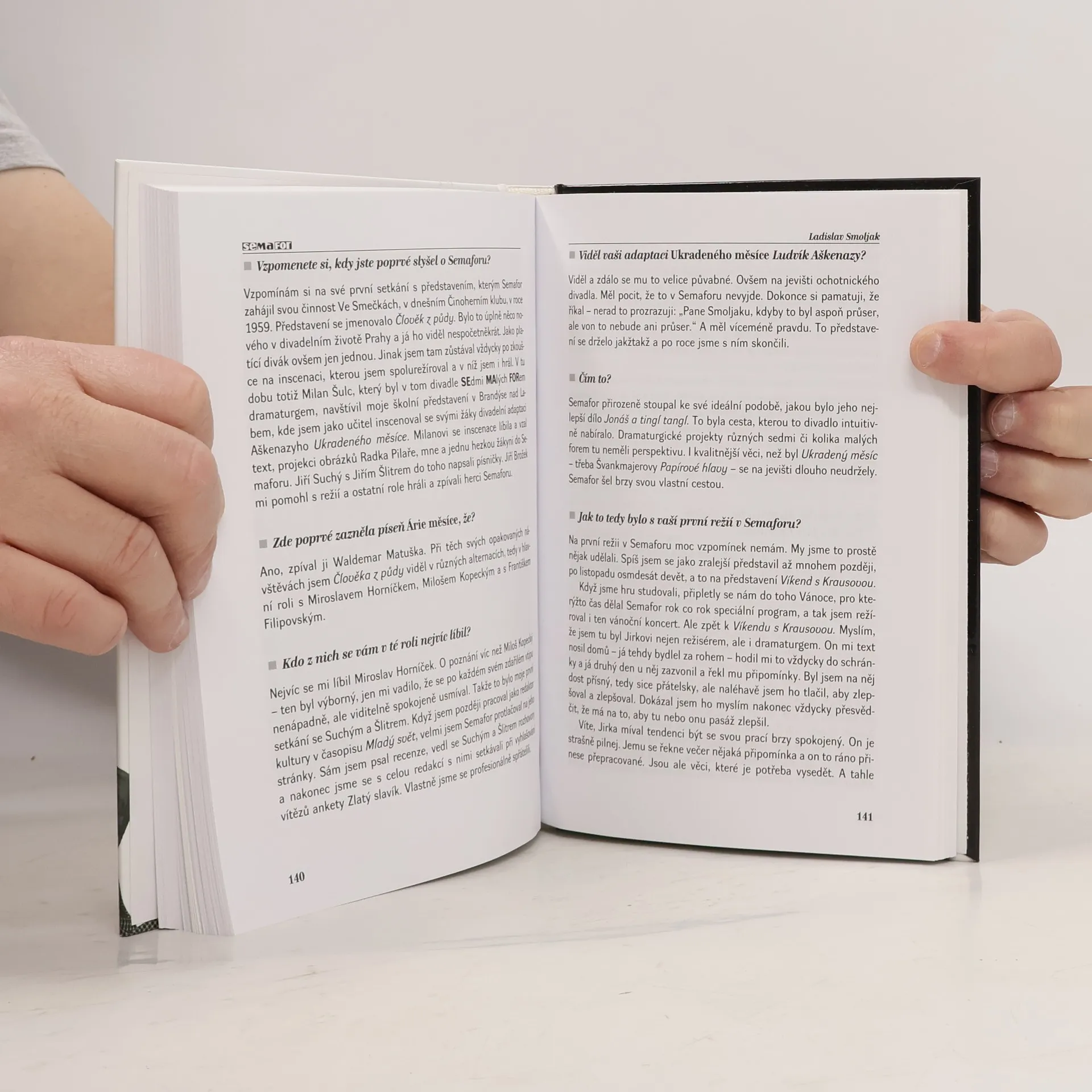 Historie divadla s přehledem herců a zpěváků, kteří v Semaforu vystupovali. Rozhovory na téma Semafor minulosti a současnosti. Autorská dvojice Marie a Tomáš Salabovi v úvodu ke knize rozhovorů přiznávají, že je k jejímu napsání vedla především snaha vzdát hold milovanému divadlu. Aby splnili slib, který si dali, oslovili 22 osobností a shromáždili vzpomínky letmé i podstatnější. Důsledně stranili dvojici Suchý-Šlitr a pominuli další podílníky Semaforu - Grossmanna, Šimka a Josefa Dvořáka. Vznikl tak obraz viděný z jednoho zorného úhlu, což může být kladem i nedostatkem knížky. Rozhovory doplňují černobílé fotografie z archivu oslovených.