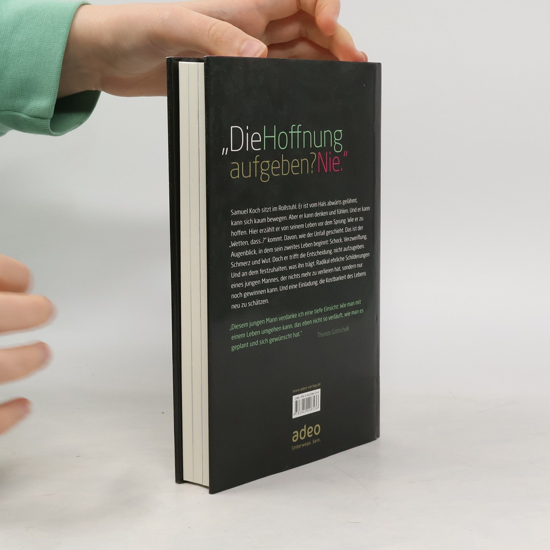 Samuel Koch sitzt im Rollstuhl. Er ist vom Hals abwärts gelähmt. Er kann noch nicht mal allein essen. Aber er kann denken und fühlen. Und er kann hoffen. Hier erzählt er von seinem Leben vor dem Sprung: wie er zu „Wetten dass ..?“ kommt. Davon, wie der Unfall geschieht. Das ist der Augenblick, in dem sein zweites Leben beginnt: Schock, Verzweiflung, Schmerz und Wut. Doch er trifft die Entscheidung, nicht aufzugeben. Und an dem Glauben festzuhalten, der ihn trägt. Radikal ehrliche Schilderungen eines jungen Mannes, der nichts mehr zu verlieren hat, sondern nur noch gewinnen kann. Und eine Einladung, die Kostbarkeit des Lebens neu zu schätzen. Mit einem Vorwort von Thomas Gottschalk und einem Nachwort von Michelle Hunziker.