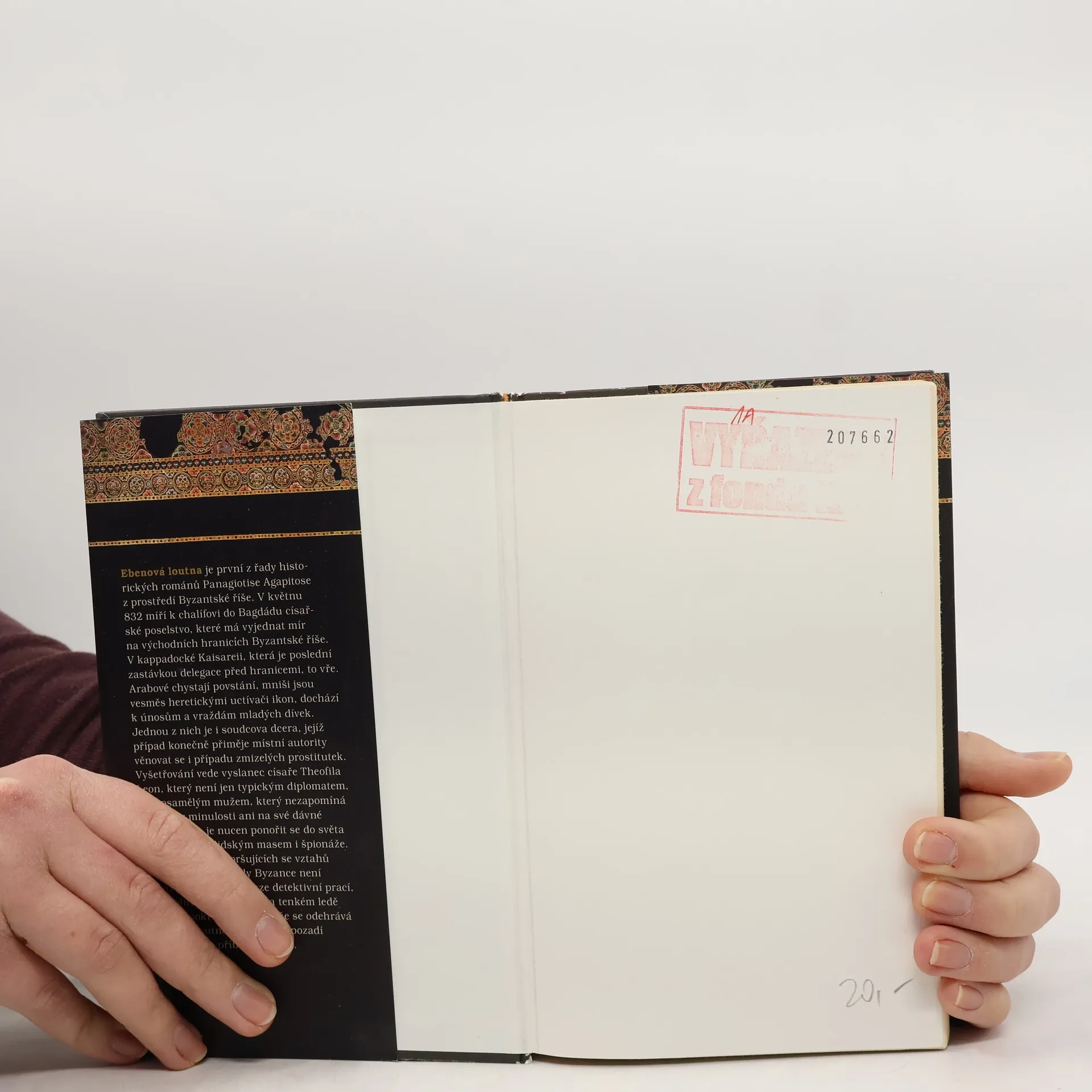 V květnu 832 míří k chalífovi do Bagdádu císařské poselstvo, které má vyjednat mír na východních hranicích byzantské říše. V kapadocké Kaisareji, která je poslední zastávkou delegace před hranicemi, to vře. Arabové chystají povstání, mniši jsou vesměs heretickými uctívači ikon, obchodníci s bílým masem kradou dívky, aby je mohli prodat na trzích s otroky v Sýrii. Zdá se, že správce nemá město pod kontrolou, a tak, když dojde k děsivé vraždě třináctileté dcery místního soudce, požádá o pomoc císařského vyslance Leona. Leon do té doby žil klidným životem vysoce postaveného státního úředníka a samotářského starého mládence. Jeho koníčkem je četba antických milostných románů a hra na loutnu. Mezi kaisarejskými kasárnami, nálevnami a nevěstinci se ocitne nejen tváří v tvář zločinům, s nimiž se dosud nesetkal, ale také ztracenému příteli z minulosti. Ebenová loutna je prvním svazkem volné trilogie historických detektivek z pera Panagiotise Agapitose, byzantologa a spisovatele, jehož dílo si nejen v Řecku získává rostoucí oblibu. Autorovi se podařilo vytvořit napínavý detektivní příběh, a zároveň poutavě přiblížit dobu a kulturu byzantské říše, která jsou dnes známé spíše užšímu okruhu odborníků. Hlavní postava byzantského hodnostáře Leona vystupuje i v dalších dvou dílech trilogie nazvaných Smaltová Medúza a Měděné oko.