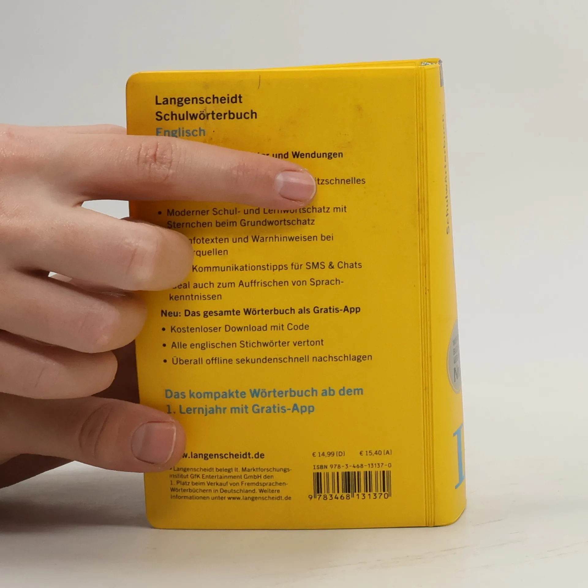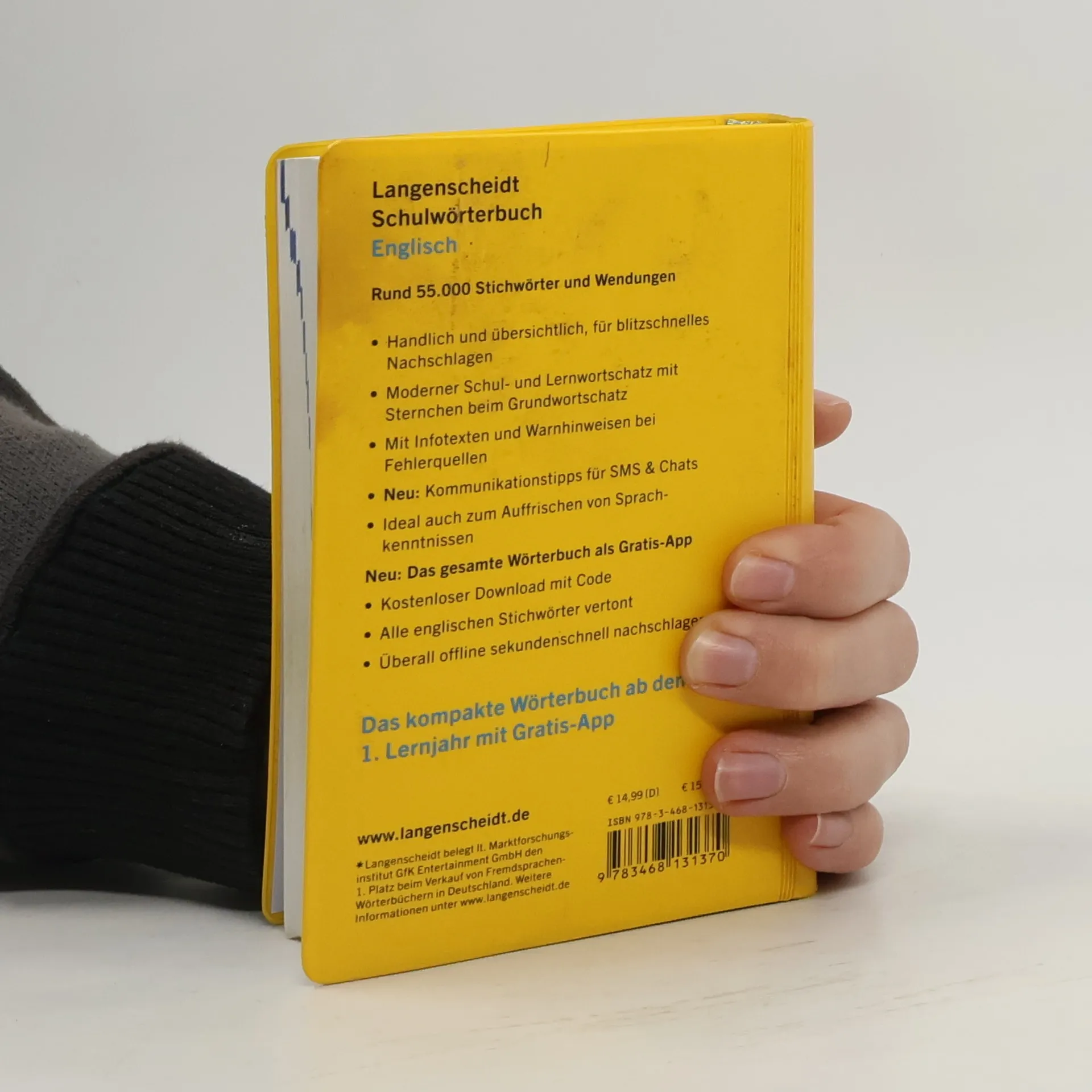Das Schulwörterbuch Englisch von Langenscheidt ist gezielt auf schulische Wünsche und Bedürfnisse zugeschnitten und optimal geeignet für die ersten Lernjahre: Der Wortschatz beinhaltet das typische Vokabular der Schulbücher der Sekundarstufe I und enthält neben der aktuellen Alltagssprache auch Begriffe aus Sport, Spiel, Computer, Umwelt, u. v. m. Das Schulwörterbuch zeichnet sich vor allem durch schülerspezifische Benutzerhinweise, eine übersichtliche Bedeutungsdifferenzierung und für Schüler relevante Angaben zur Grammatik bei den englischen Stichwörtern aus. Rund 55.000 Stichwörter und Wendungen Hochaktueller Wortschatz Jetzt neu mit Wörterbuch-App Markierter englischer Grundwortschatz Info-Fenster zu Wortschatz, Grammatik und Landeskunde Unregelmäßige englische Verben und Kommunikations-Extras Zielgruppe: Schülerinnen und Schüler in der Sekundarstufe I