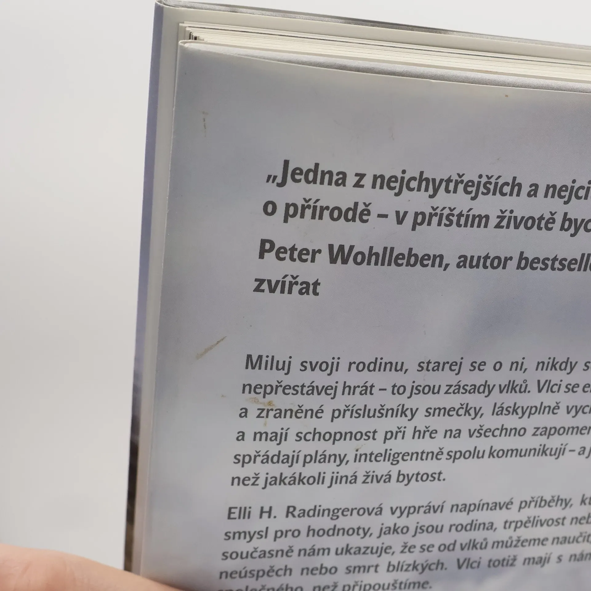 Miluj svoji rodinu, starej se o ni, nikdy se nevzdávej a nikdy si nepřestávej hrát – to jsou zásady vlků. Vlci se empaticky starají o staré a zraněné příslušníky smečky, láskyplně vychovávají své potomky a mají schopnost při hře na všechno zapomenout. Přemýšlejí, sní, spřádají plány, inteligentně spolu komunikují – a jsou nám podobnější než jakákoli jiná živá bytost. Elli H. Radingerová, nejrespektovanější německá odbornice na život vlků, vypráví napínavé příběhy, které dokládají vlčí smysl pro hodnoty, jako jsou smysl pro rodinu, důvěru, trpělivost, pozornost, zpracování neúspěchů nebo smrti. Autorka nám představuje zásadní a mnohdy dosud neznámé poznatky o životě vlků a ukazuje: vlci by byli lepšími lidmi, než jsme my…