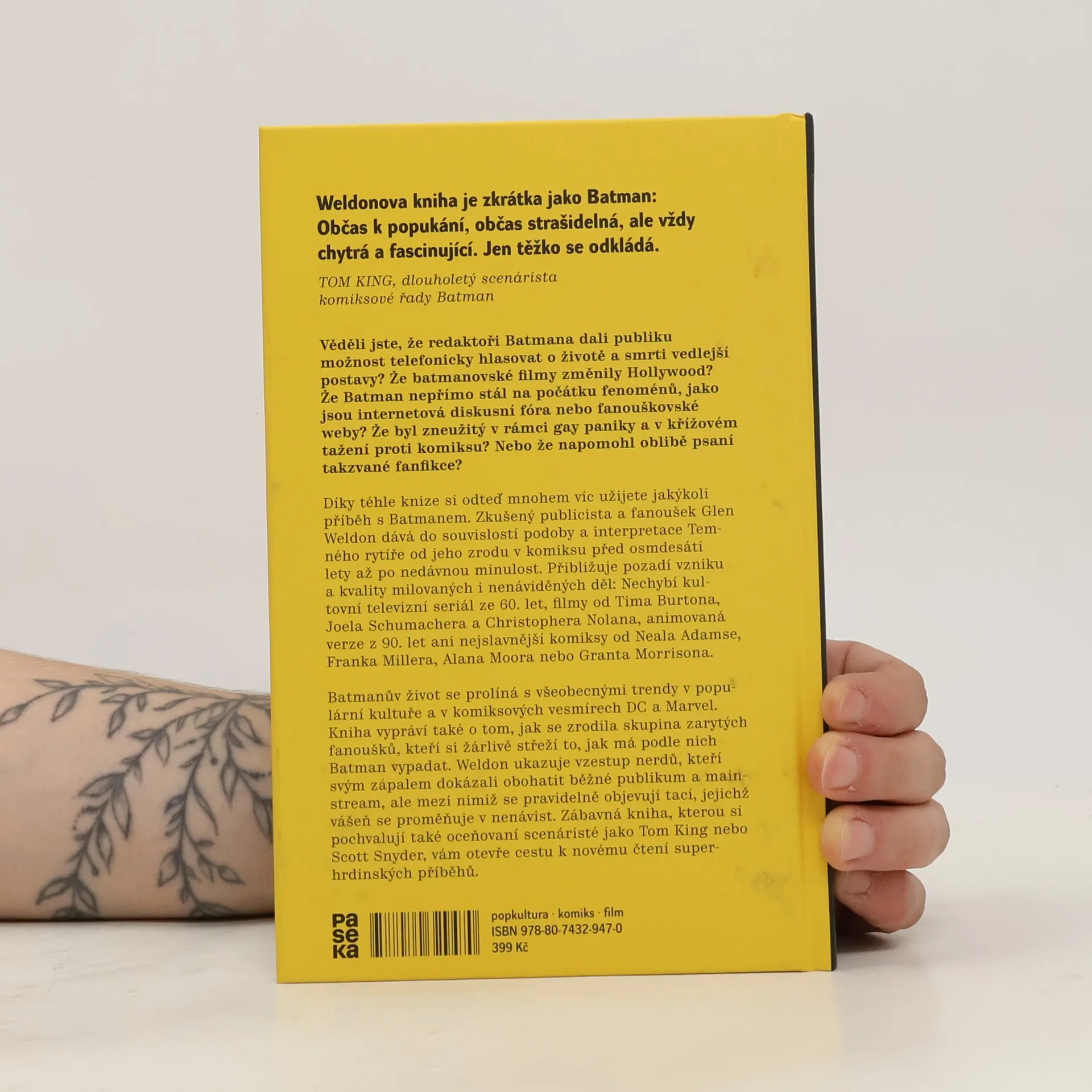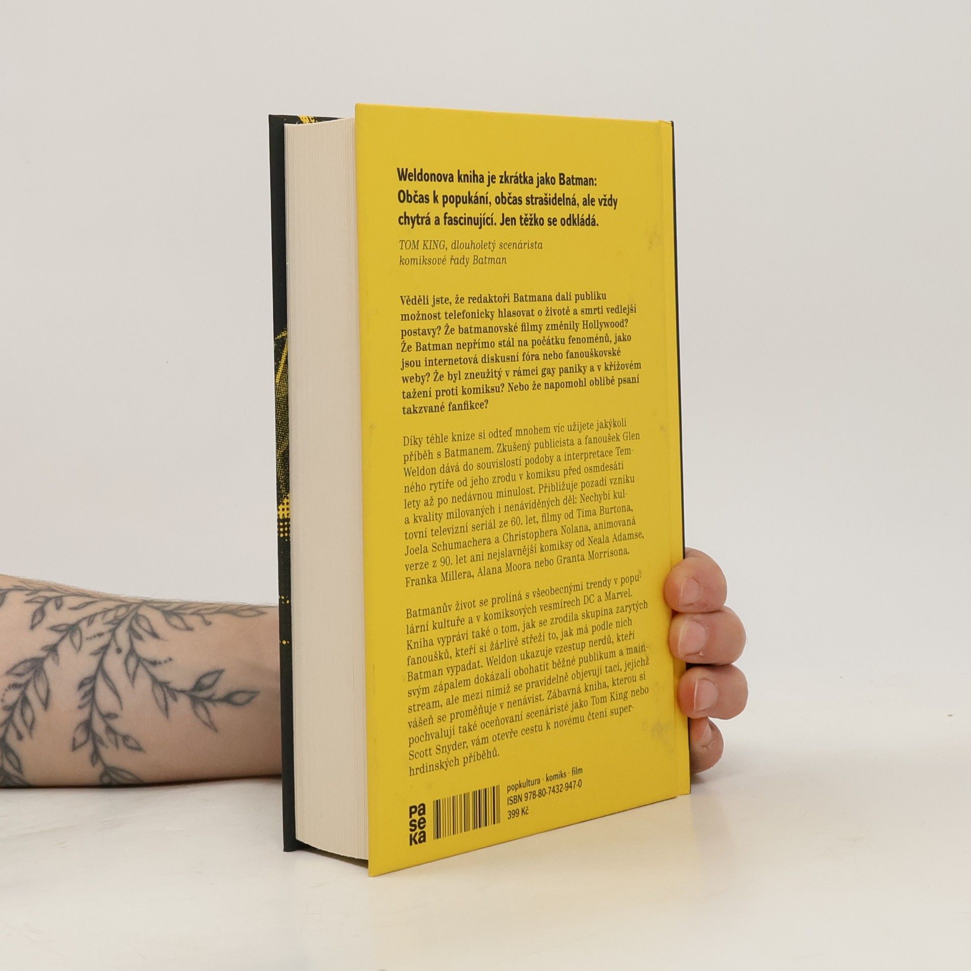 Historie Batmana a zrod nerdů. Tahle kniha ukrývá víc překvapení než Batmanův opasek. Věděli jste, že redaktoři Batmana dali publiku možnost telefonicky hlasovat o životě a smrti vedlejší postavy? Že filmy s Batmanem navždy změnily hollywoodský marketing? Že nepřímo stál na počátku fenoménů, jako jsou internetová diskusní fóra nebo fanouškovské weby, a že napomohl oblibě psaní takzvané fanfikce? Zkušený publicista a fanoušek Glen Weldon dává do souvislostí podoby a interpretace Temného rytíře od jeho zrodu v komiksu před 80 lety až po nedávnou minulost. Přibližuje pozadí vzniku a kvality milovaných i nenáviděných děl: Nechybí televizní seriál ze 60. let, filmy od Tima Burtona, Joela Schumachera a Christophera Nolana, animovaná verze z 90. let ani nejslavnější komiksy od Neala Adamse, Franka Millera, Alana Moora nebo Granta Morrisona. Batmanův život na papíře i mimo něj se prolíná se vznikem kultury zarytých fanoušků, kteří si žárlivě střeží to, jak má podle nich Batman vypadat a koho má reprezentovat. Weldon ukazuje vzestup nerdů, kteří svým zápalem dokázali obohatit běžné publikum a mainstream, ale mezi nimiž se pravidelně objevují tací, jejichž vášeň se proměňuje v nenávist. Objevná kniha, kterou si pochvalují také oceňovaní scenáristé jako Tom King nebo Scott Snyder, vám otevře cestu k novému čtení Batmanových příběhů.