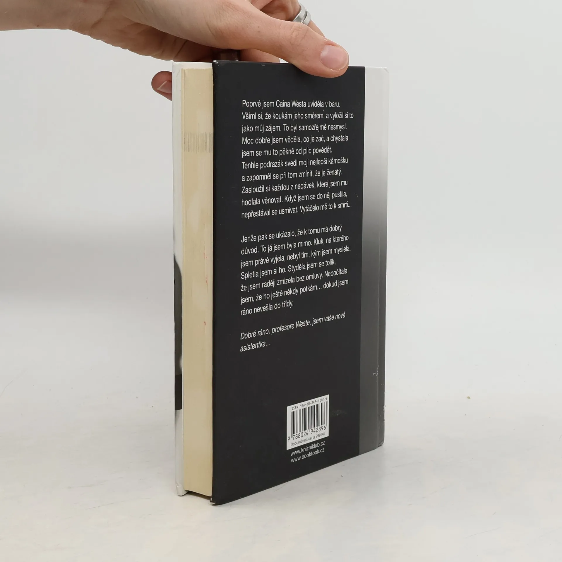 Poprvé jsem Caina Westa uviděla v baru. Všimnul si, že koukám jeho směrem, a vyložil si to tak, že mám zájem. To byl samozřejmě nesmysl. Moc dobře jsem věděla, co je zač, a chystala jsem se mu to pěkně od plic povědět. Tenhle podrazák svedl moji nejlepší kámošku a zapomněl se přitom zmínit, že je ženatý. Zasloužil si každou jednu nadávku, kterou jsem mu plánovala věnovat. Když jsem se do něj pustila, nepřestával se usmívat. Vytáčelo mě to k smrti. Jenže pak se ukázalo, že k tomu má dobrý důvod. To já jsem byla mimo. Kluk, na kterého jsem právě vyjela, nebyl tím, kým jsem myslela. Spletla jsem si ho. Styděla jsem se tolik, že jsem raději zmizela bez omluvy. Nepočítala jsem, že ho ještě někdy potkám…¬ dokud jsem ráno nevešla do třídy. Dobré ráno, profesore Weste, jsem vaše nová asistentka…