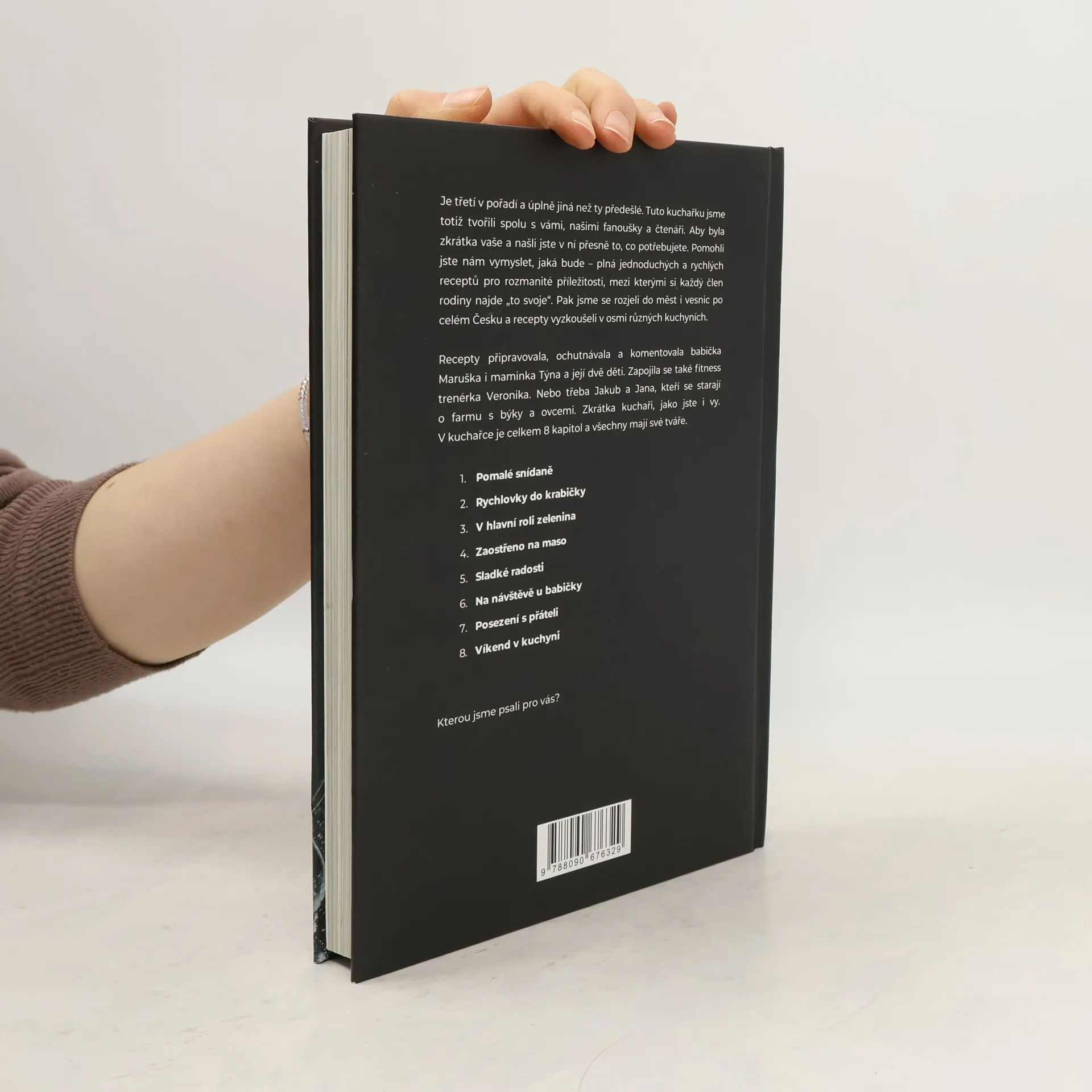 Máme za sebou pěkný kus cesty. Slíbili jsme, že připravíme kuchařku podle vašich přání. Tak jsme pracovali 8 měsíců, ujeli 1 438 kilometrů, vařili v osmi kuchyních po různých koutech Česka – a nezapomněli se radit s vámi. Děkujeme vám za pomoc a podporu! V kuchařce najdete od každého něco – péct budete s mámou Týnou a jejími dětmi. S babičkou Maruškou a její vnučkou ochutnáte tradiční recepty v netradiční podobě. A s fitness trenérkou Verčou se podíváte na to, jaké recepty si můžete zabalit s sebou do krabičky. V celkem 8 kapitolách najdete 110 receptů pro různé příležitosti.
