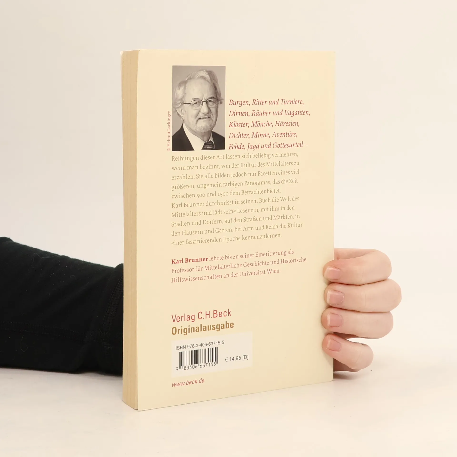 Karl Brunner legt eine kurzgefasste Kulturgeschichte des Mittelalters vor, die den gesamten Lebenskreis eines mittelalterlichen Menschen einbezieht: Körper und Gefühl, Geist und Seele, Haus und Burg, Schänke und Spital, Lohn und Lehen, Krieg und Fest, Stadt und Kathedrale, Märkte und Gärten, Kloster und Totenacker und schließlich das Paradies. Er führt seine Leser an die Tische der Bauern und die Tafeln des Adels, in die Bergwerke und in die Schreibstuben der Gelehrten und ebenso zu Juden, Muslimen, Ketzern und Priestern. Dabei erzählt er von Dirnen und Dichtern, von Liebenden und Asketen, von Musikern und Händlern, von Artus, Tristan, Dietrich von Bern und von den Kreuzrittern – und von vielem anderen mehr.