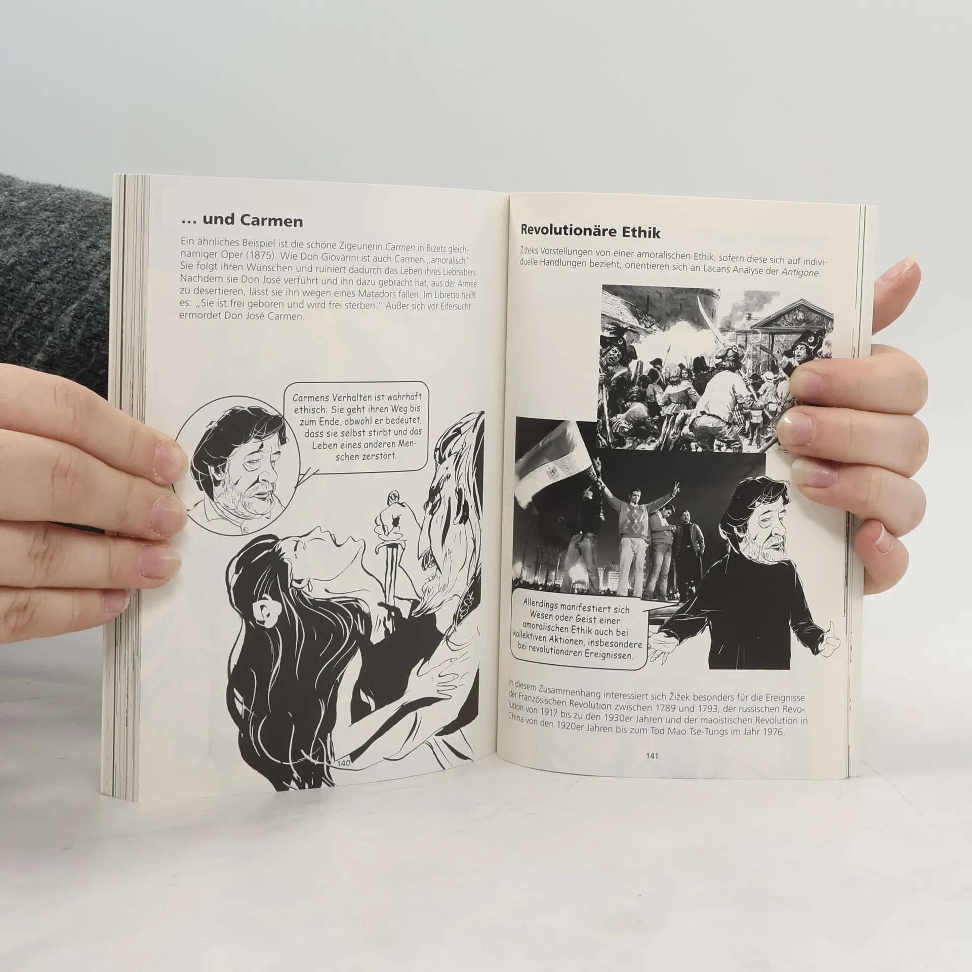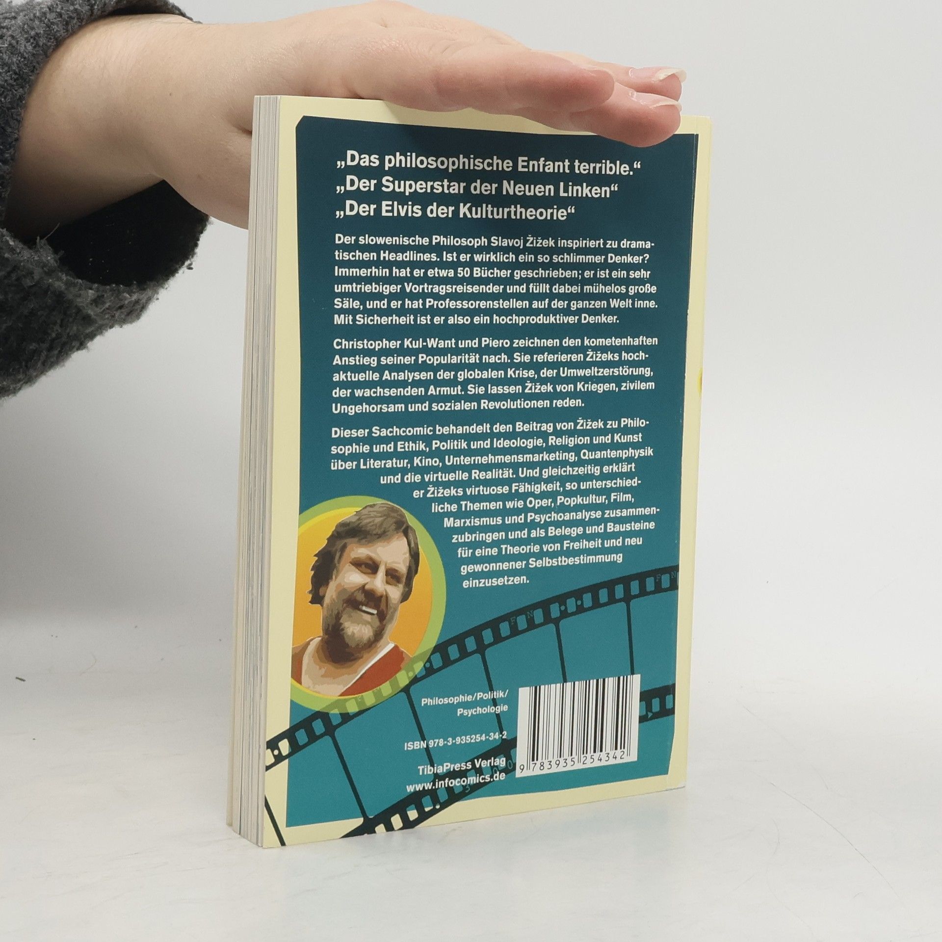 „Das philosophische Enfant terrible.“ „Der Superstar der Neuen Linken“ „Der Elvis der Kulturtheorie“ „Einer der meist-rezipierten und gleichzeitig umstrittensten politischen Philosophen.“ Der slowenische Philosoph Slavoj Žižek inspiriert zu dramatischen Headlines. Ist er wirklich ein so schlimmer Denker? Immerhin hat er etwa 50 Bücher geschrieben; er ist ein sehr umtriebiger Vortragsreisender und füllt dabei mühelos große Säle und er hat Professorenstellen auf der ganzen Welt inne. Mit Sicherheit ist er also ein hoch produktiver Denker. Christopher Kul-Want und Piero zeichnen den kometenhaften Anstieg seiner Popularität nach. Sie referieren Žižeks hochaktuelle Analysen der globalen Krise, der Umweltzerstörung, der wachsenden Armut. Sie lassen Žižek von Kriegen, zivilem Ungehorsam und sozialen Revolutionen reden. Dieser Sachcomic behandelt den Beitrag von Žižek zu Philosophie und Ethik, Politik und Ideologie, Religion und Kunst über Literatur, Kino, Unternehmensmarketing, Quantenphysik und die virtuelle Realität. Und gleichzeitig erklärt er Žižeks virtuose Fähigkeit, so unterschiedliche Themen wie Oper, Popkultur, Film, Marxismus und Psychoanalyse zusammenzubringen und als Belege und Bausteine für eine Theorie von Freiheit und neu gewonnener Selbstbestimmung einzusetzen.