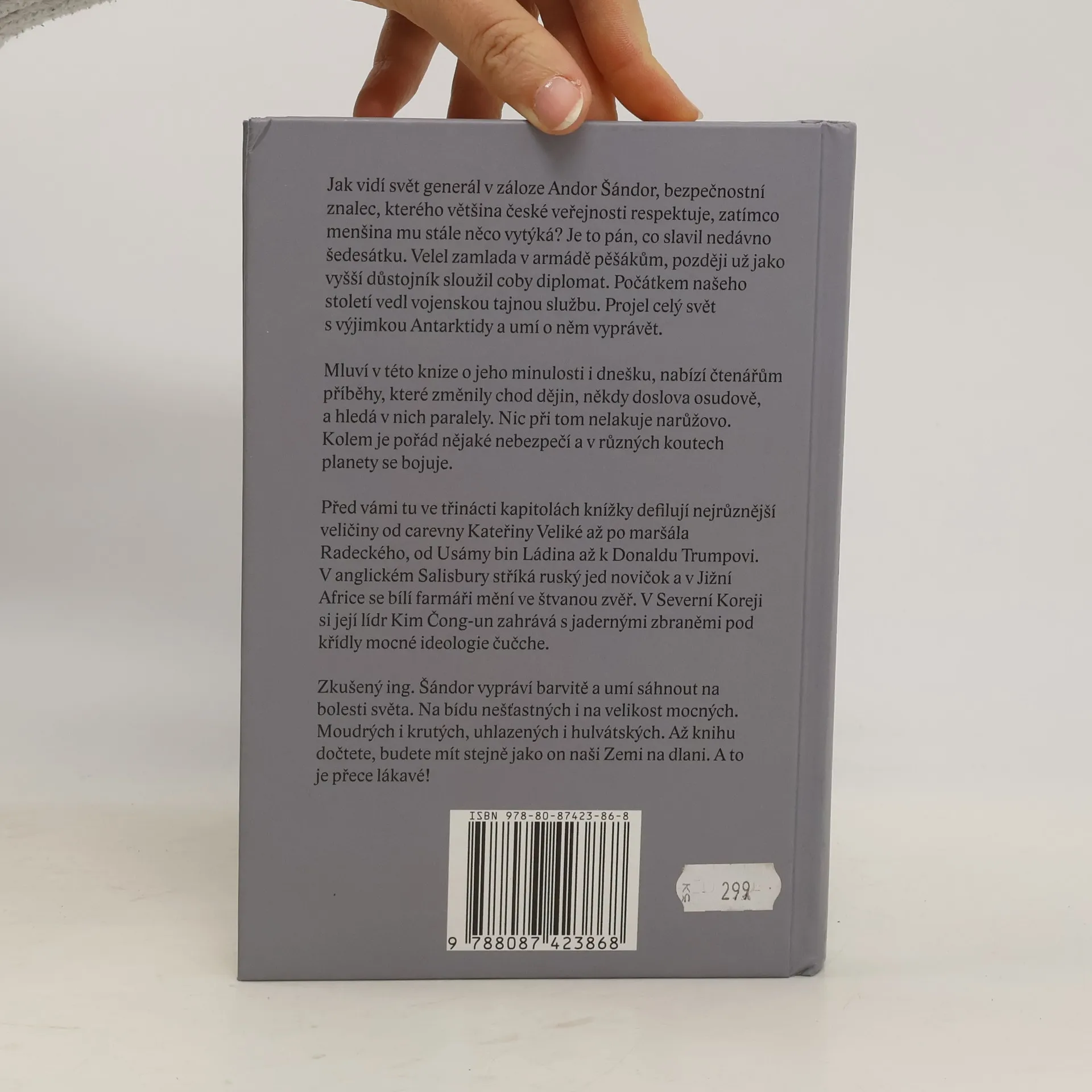 Jak vidí svět generál v záloze Andor Šándor, bezpečnostní znalec, kterého většina české veřejnosti respektuje, zatímco menšina mu stále něco vytýká? Je to pán, co slavil nedávno šedesátku. Velel zamlada v armádě pěšákům, později už jako vyšší důstojník sloužil coby diplomat. Počátkem našeho století vedl vojenskou tajnou službu. Projel celý svět s výjimkou Antarktidy a umí o něm vyprávět. Mluví v této knize o jeho minulosti i dnešku, nabízí čtenářům příběhy, které změnily chod dějin, někdy doslova osudově, a hledá v nich paralely. Nic při tom nelakuje narůžovo. Kolem je pořád nějaké nebezpečí a v různých koutech planety se bojuje. Před vámi tu ve třinácti kapitolách knížky defilují nejrůznější veličiny od carevny Kateřiny Veliké až po maršála Radeckého, od Usámy bin Ládina až k Donaldu Trumpovi. V anglickém Salisbury stříká ruský jed novičok a v Jižní Africe se bílí farmáři mění ve štvanou zvěř. V Severní Koreji si její lídr Kim Čong-un zahrává s jadernými zbraněmi pod křídly mocné ideologie čučche. Zkušený ing. Šándor vypráví barvitě a umí sáhnout na bolesti světa. Na bídu nešťastných i na velikost mocných. Moudrých i krutých, uhlazených i hulvátských. Až knihu dočtete, budete mít stejně jako on naši Zemi na dlani. A to je přece lákavé!