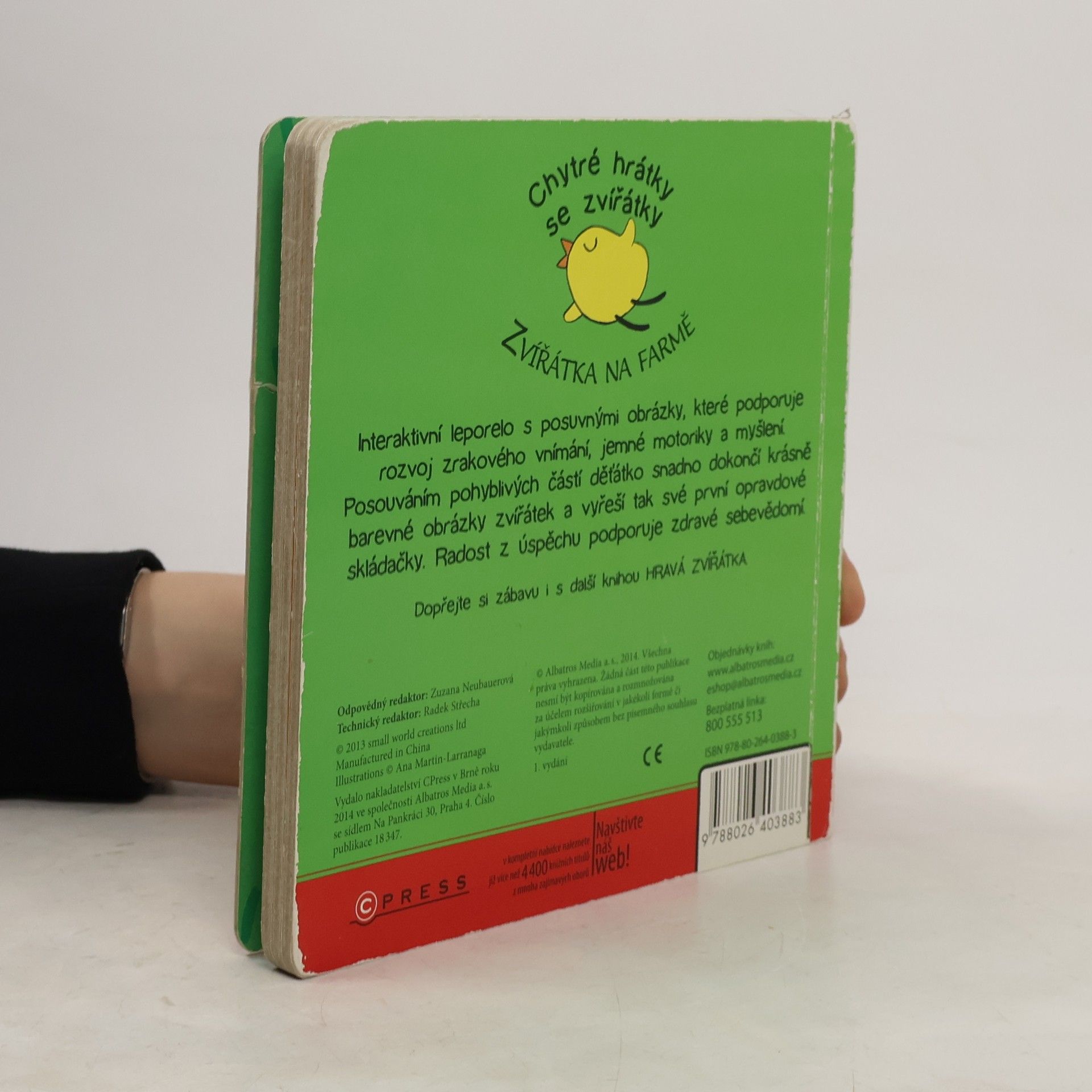Interaktivní leporelo s posuvnými obrázky, které podporuje rozvoj zrakového vnímání, jemné motoriky a myšlení. Posouváním pohyblivých částí děťátko snadno dokončí krásně barevné obrázky zvířátek a vyřeší tak své první opravdové skládačky. Radost z úspěchu podporuje zdravé sebevědomí. Dopřejte si zábavu i s další knihou HRAVÁ ZVÍŘÁTKA.