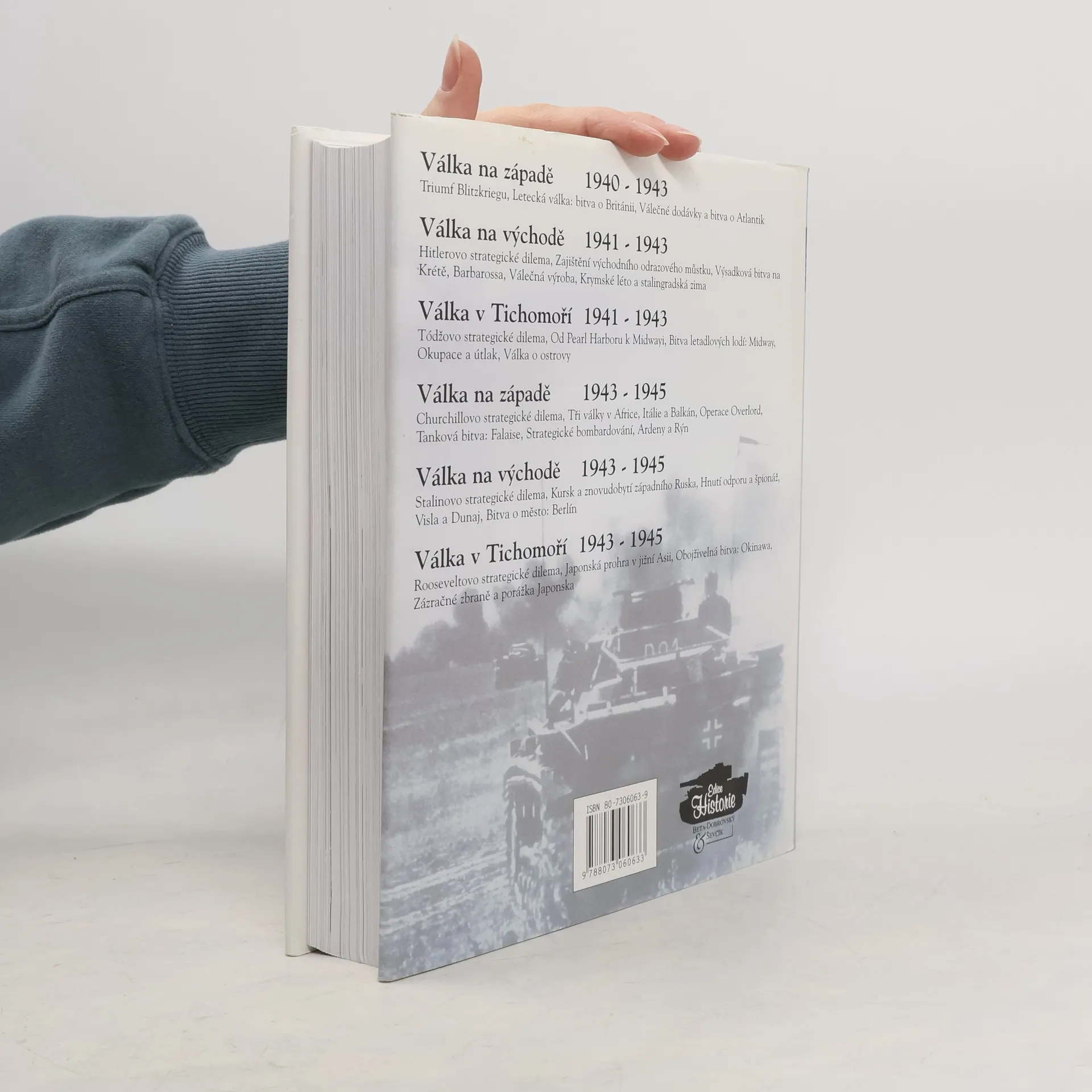 Kniha britského vojenského historika o dosud největším konfliktu v dějinách lidstva. Autor se rozohdl rozdělit příběh na čtyři části - popisnou a strategickou anylýzu, bitevní výjev a "téma dané válka" - ty pak využít v rámci všech šesti hlavních oddílů knihy. To jsou Válka na západě 1940-1943, Válka na východě 1941-1943, Válka v Tichomoří 1941-1943, Válka na západě 1943-1945, Válka na východě 1943-1945, Válka v Tichomoří 1943-1945. Úvod každého oddílů je věnován strategické analýze zaměřené na osobnost, která v příslušném období hrála největší roli. Postupně se zde tedy jedná o Hitlerovi, generálu Tódžovi, Churchillovi, Stalinovi a Roosveltovi. Oddíl dále obsahuje, kromě nezbytného popisu událostí, jak příslušné "téma války", tak odpovídající bitevní výjev. Každý z bitevních výjevů byl zvolen tak, aby ilustroval povahu specifické formy válečnictví, charakteristické pro ten určitý konflikt. Najdeme zde popis leteckých bojů, výsadkářského válečnictví, námořních bitev, tankových bitev, pouličních bojů či obojživelných válečných operací. V "tématech válka" získáme informace o válečné výrobě a zásobování, o životě v týlu, o okupaci a represáliích, o hnutí odporu, o špionáži či o tajných zbraních.