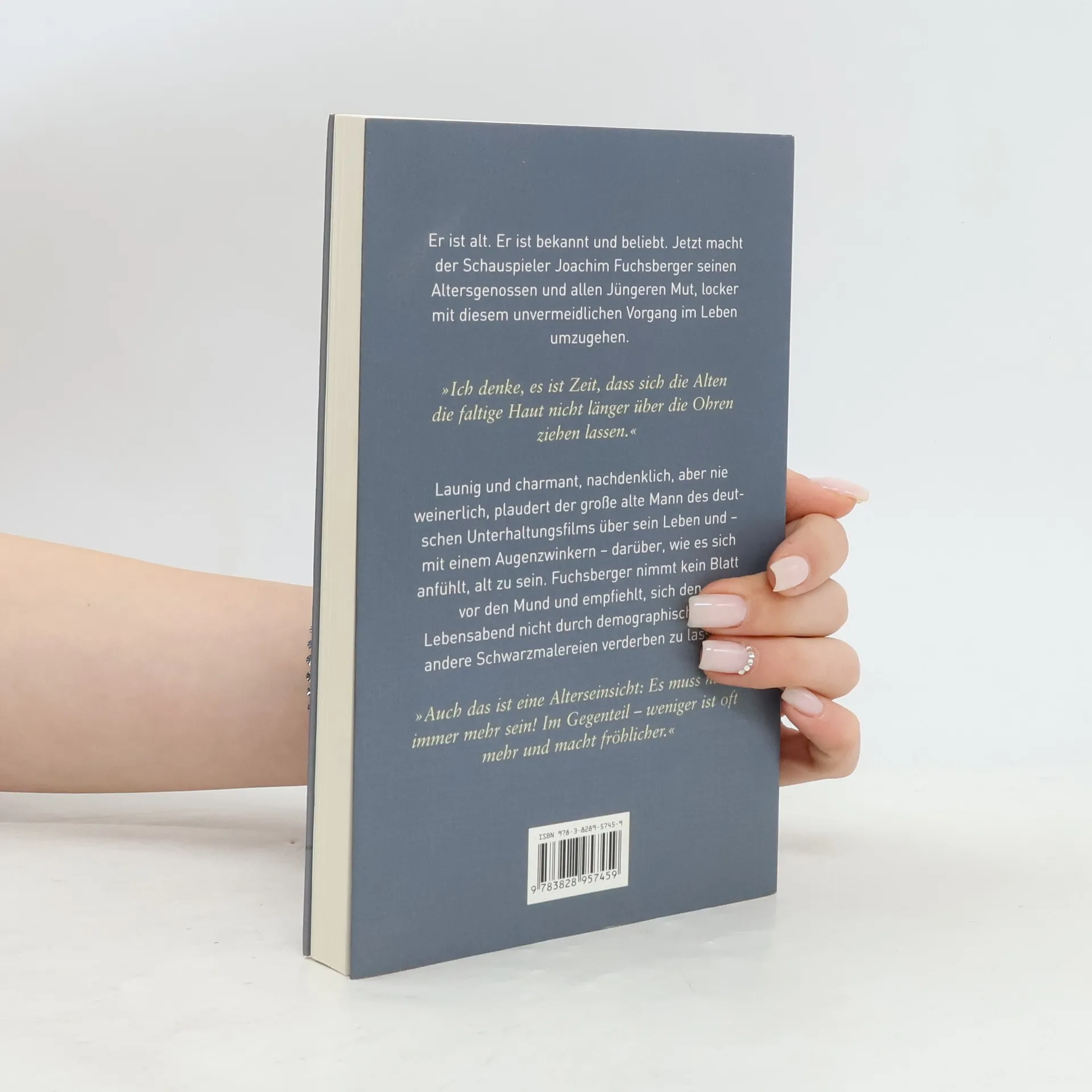 Wie man in Würde und mit einem Augenzwinkern alt werden kann - Nachdenken über das Alter – authentisch und unterhaltsam- Ein lesenwertes, heiter-ironisches Buch von einem Sympathieträger erster GüteEr ist alt. Er ist bekannt und beliebt. Jetzt macht der Schauspieler Joachim Fuchsberger seinen Altersgenossen und allen Jüngeren, die ja auch irgendwann mal alt werden, Mut, locker mit diesem unvermeidlichen Vorgang im Leben umzugehen: »Ich denke, es ist Zeit, dass sich die Alten die faltige Haut nicht länger über die Ohren ziehen lassen. Hören wir auf, im stillen Kämmerlein und vor der Glotze auf die Schwätzer aus den Amtsstuben zu hören, lassen wir uns keine Angst mehr einjagen von den Neunmalklugen, wo immer sie sitzen.«Launig und charmant, nachdenklich, aber nie weinerlich, plaudert der große alte Mann des deutschen Unterhaltungsfilms über die Blüte seines Lebens und darüber, wie es sich anfühlt, wenn sie langsam dahinwelkt. Fuchsberger nimmt kein Blatt vor den Mund und empfiehlt, sich den Lebensabend nicht durch demographische Schwarzmalerei verderben zu lassen.