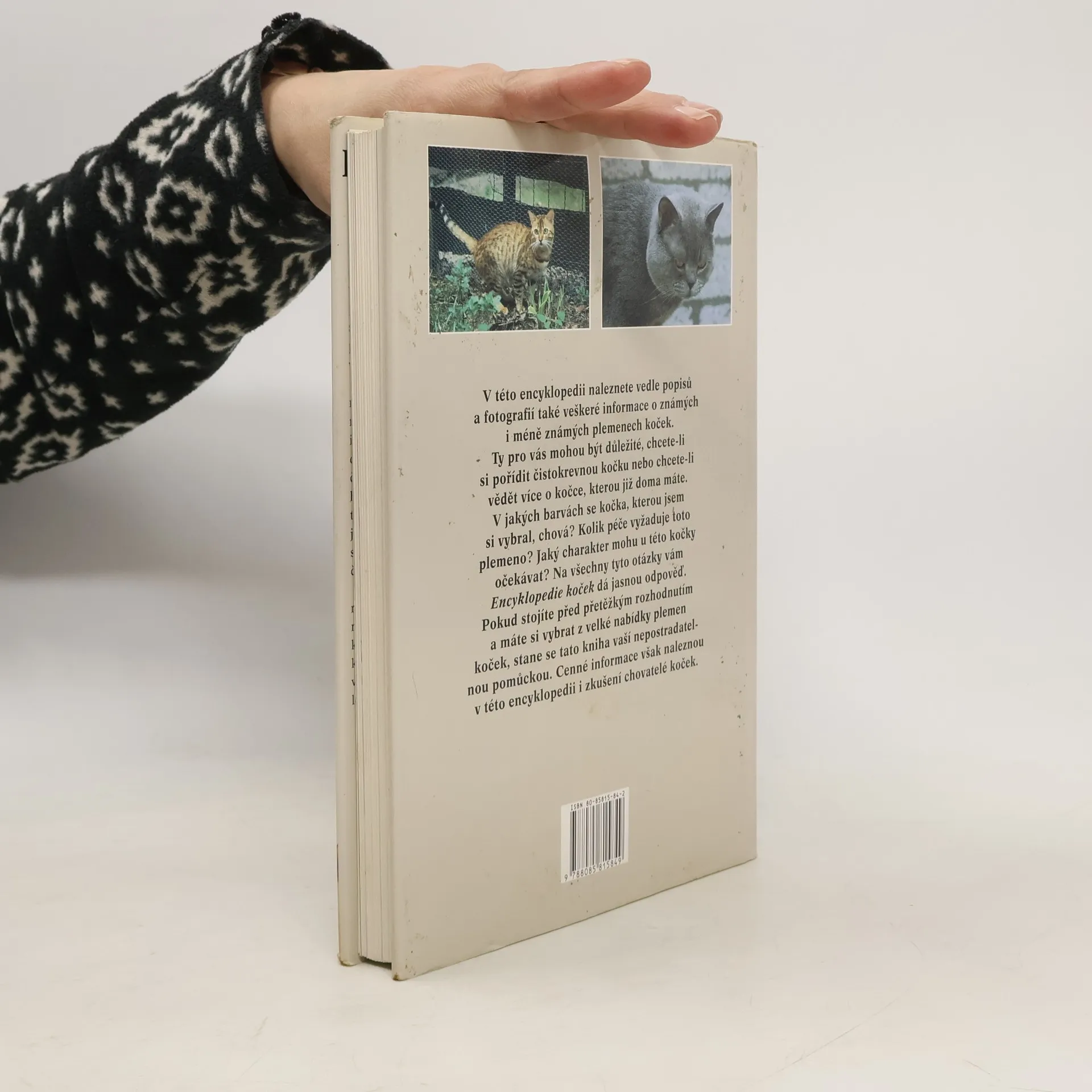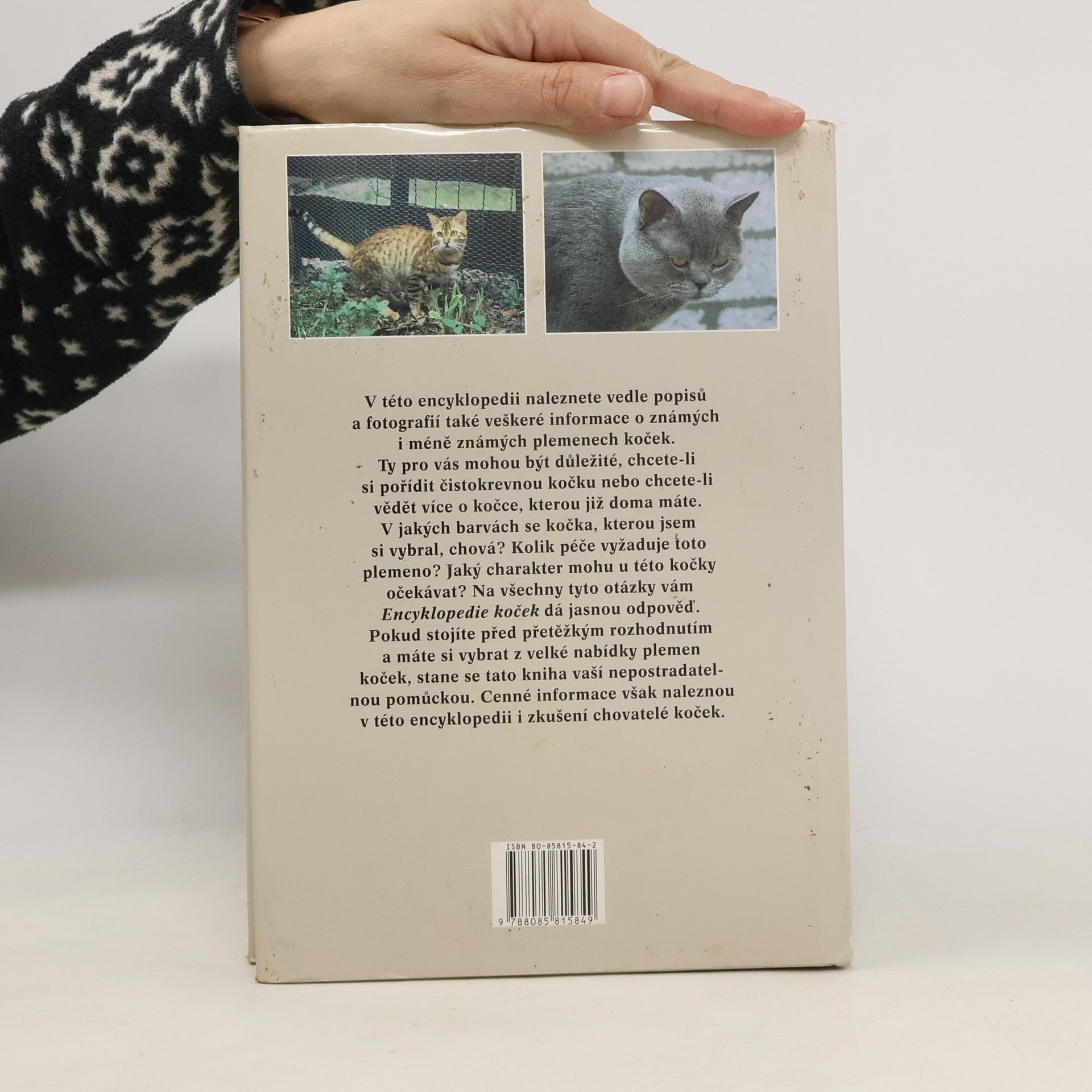 Při výběru čistokrevné kočky je většinou rozhodujícím faktorem její vzhled. Proti tomu nelze nic namítat, pokud ovšem člověk počítá také s charakterem zvířete a s tím, kolik péče a pozornosti mu bude muset věnovat. Vedle řady popisů a fotografií známých i méně známých plemen koček naleznete v této encyklopedii veškeré informace, které pro vás mohou být důležité, pokud si chcete pořídit čistokrevnou kočku, která by se k vám hodila. V encyklopedii jsou uvedena také zajímavá nová plemena, která ještě nejsou uznána všemi chovatelskými organizacemi, jako je například česká kadeřavá kočka Bohemia rex. Pokud stojíte před přetěžkým rozhodnutím a máte si vybrat z velké nabídky plemen koček, stane se tato kniha vaší nepostradatelnou pomůckou. Cenné informace však naleznou v této encyklopedii i zkušení chovatelé koček. Na titulní stránce je překlep ve jméně autorky.