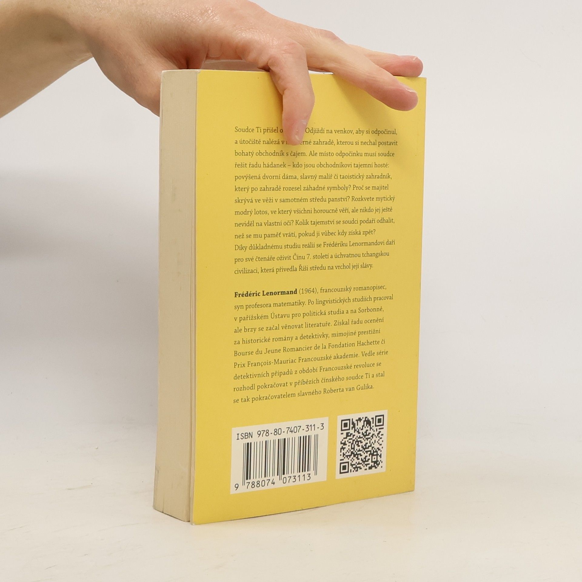 Soudce Ti přišel o paměť! Odjíždí na venkov za větším klidem a útočiště nalézá v nádherné zahradě, kterou si nechal postavit bohatý obchodník s čajem. Během odpočinku se ale před soudcem vyjeví řada záhad – kdo jsou obchodníkovi tajemní hosté: namyšlená dvořanka, slavný básník či taoistický zahradník, který zahradu zaplnil záhadnými symboly? Proč se majitel skrývá ve věži postavené v samotném středu panství? Podaří se jim spatřit bájný modrý lotos, ve který všichni bezmezně věří, ale nikdo jej ještě neviděl na vlastní oči? Kolik tajemství se soudci podaří odhalit, než se mu paměť vrátí, pokud vůbec? Díky důkladnému studiu reálií se Frédériku Lenormandovi daří pro své čtenáře oživit Čínu 7. století a úchvatnou tchangskou civilizaci, která přivedla Říši středu na vrchol její slávy.