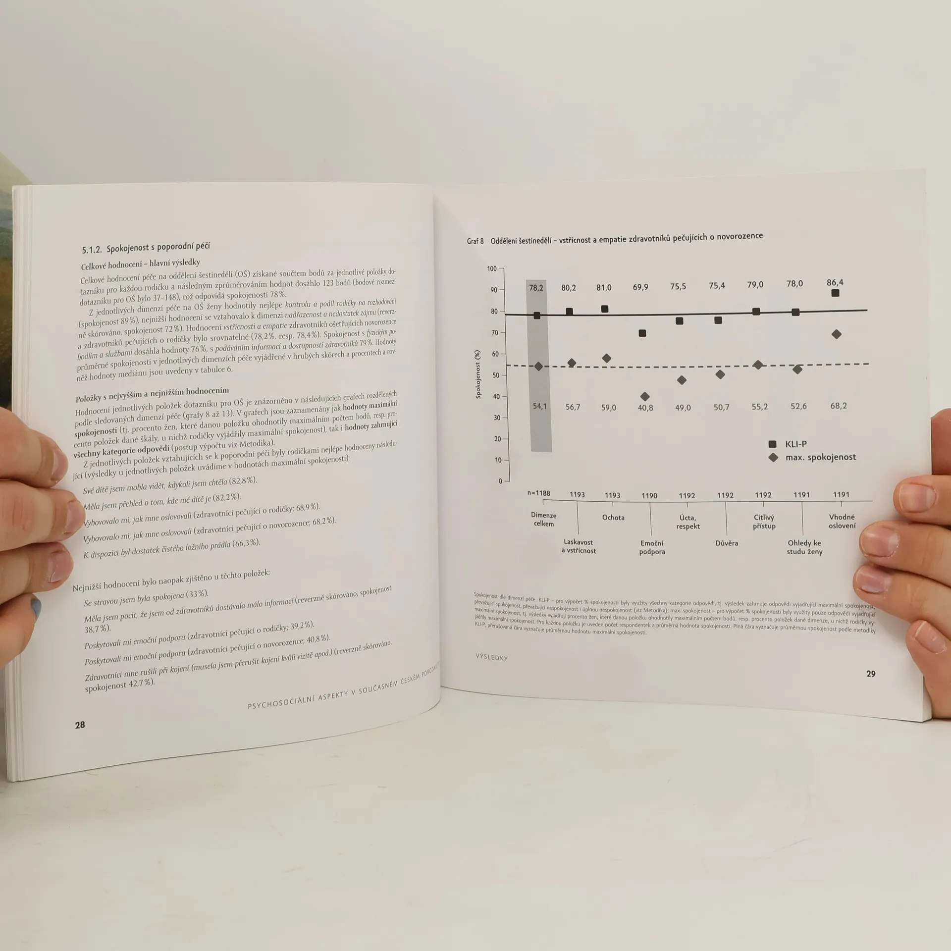 Výzkumný tým Katedry psychologie FF UK realizoval v letech 2010-2012 výzkum zaměřený na psychosociální aspekty péče v českých porodnicích. Publikace přináší aktuální informace o spokojenosti žen s péčí v českých porodnicích na základě dat od reprezentativního souboru 1195 českých rodiček, které porodily v letech 2005-2012 ve zdravotnických zařízeních v ČR. Obsahuje výsledky hodnocení perinatální péče pro celou ČR, pro jednotlivé kraje a její součástí je i vyhodnocení některých vybraných porodnic. Porovnávány jsou fakultní a nefakultní nemocnice, malé a velké porodnice (podle hranice 500 a 800 porodů za rok) a různé skupiny zdravotníků (porodní asistentky a lékaři na porodnickém oddělení a zdravotníci pečující o rodičky a zdravotníci pečující o novorozence v rámci poporodní péče). Pozornost je věnována i rozdílům ve spokojenosti u prvorodiček a vícerodiček, žen po přirozeném porodu a po císařském řezu, žen s nižším a vyšším vzděláním, žen ubytovaných na nadstandardním a na běžném pokoji a žen, které porodnici hodnotily do dvou měsíců/jednoho roku po porodu a později.