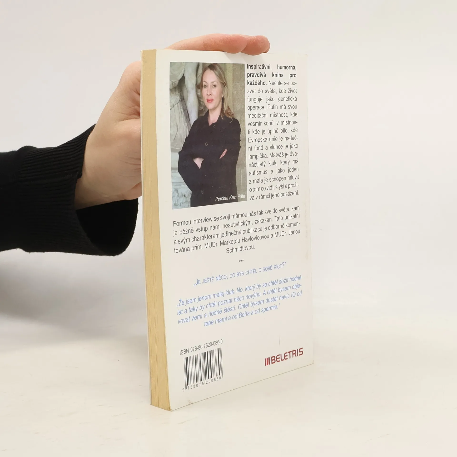 Inspirativní, humorná, pravdivá kniha pro každého. Nechte se pozvat do světa, kde život funguje jako genetická operace, Putin má svou meditační místnost, kde vesmír končí v místnosti kde je úplně bílo, kde Evropská unie je nadační fond a slunce je jako lampička. Matyáš je dvanáctiletý kluk, který má autismus a jako jeden z mála je schopen mluvit o tom co vidí, slyší a prožívá v rámci jeho postižení. Formou interview se svojí mámou nás tak zve do světa, kam je běžně vstup nám, neautistickým, zakázán. Tato unikátní a svým charakterem jedinečná publikace je odborně komentována prim. MUDr. Markétou Havlovicovou a MUDr. Janou Schmidtovou.