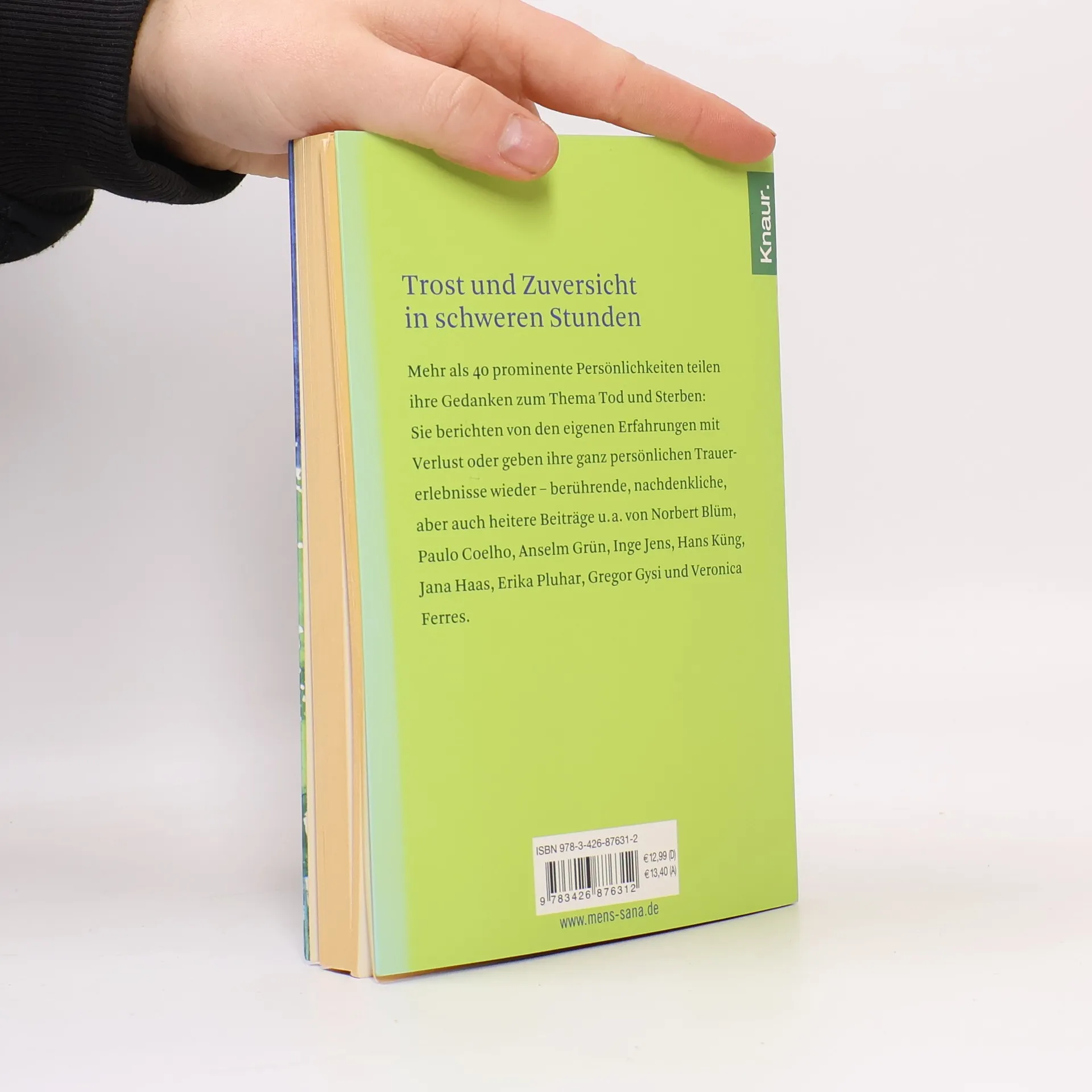 Promis von ihrer ganz persönlichen Seite. Mehr als 40 prominente Persönlichkeiten erzählen von Sterben, Tod und Trauer – berührende, heitere und nachdenkliche Beiträge u. a. von Norbert Blüm, Paulo Coelho, Anselm Grün, Claus Hipp, Inge Jens, Hans Küng, Erika Pluhar, Gregor Gysi, Veronika Ferres u. v. m. Sie finden Worte zu einem sehr persönlichen, aber in unserer Gesellschaft noch immer tabuisierten Thema, das viele Menschen sprachlos macht.