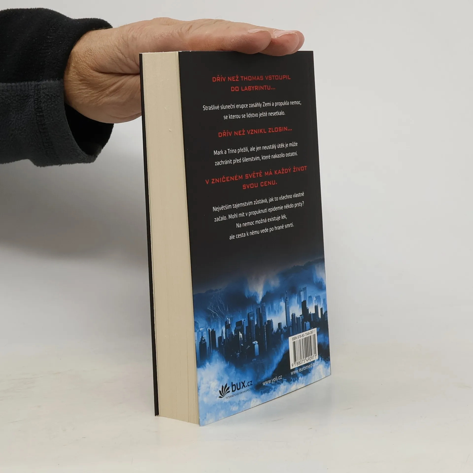 Prequel úspěšné sci-fi série „Labyrint“. Ještě předtím, než byl ustaven ZLOSIN, ještě předtím, než Thomas vstoupil do labyrintu, zasáhly Zemi sluneční erupce a propukla nemoc, se kterou se lidstvo dosud nesetkalo. Mark a Trina přežili erupce, ale to se ukázalo jen jako rozcvička před hrůzami, které je čekají. Nemoc, která se projevuje agresí a šílenstvím, zachvacuje postupně celý kontinent, a nikdo neví, odkud se strašlivý virus vzal. Panují pochybnosti, že v tom mohl být něčí zvrácený zájem… Mark a Trina jsou přesvědčeni, že existuje způsob, jak zachránit ty, které nemoc ještě nezničila. Jejich cesta za lékem na erupci je ale trnitá. V zdevastovaném světě má každý svou cenu, a oni by byli nejcennější jako mrtví...